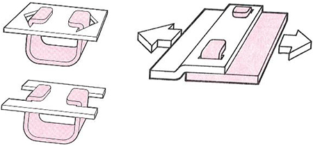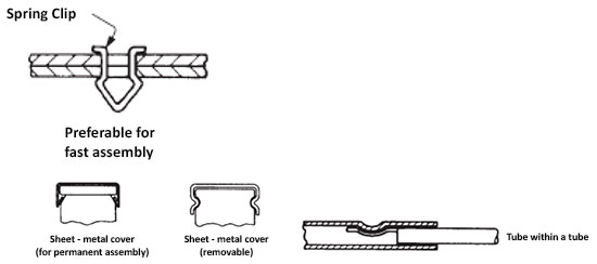 Spring force can be used to fasten parts together. The figures below illustrate the type of fastening effect that can be achieved with spring-type holding devices. The assembly operation requires only that the spring or spring-like receptacles be snapped into place.