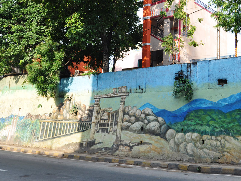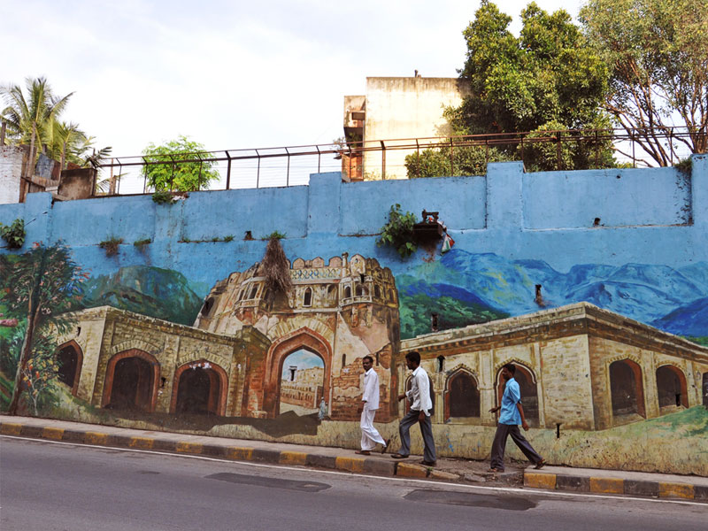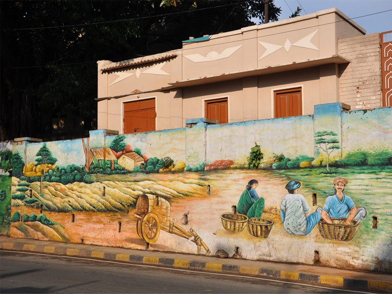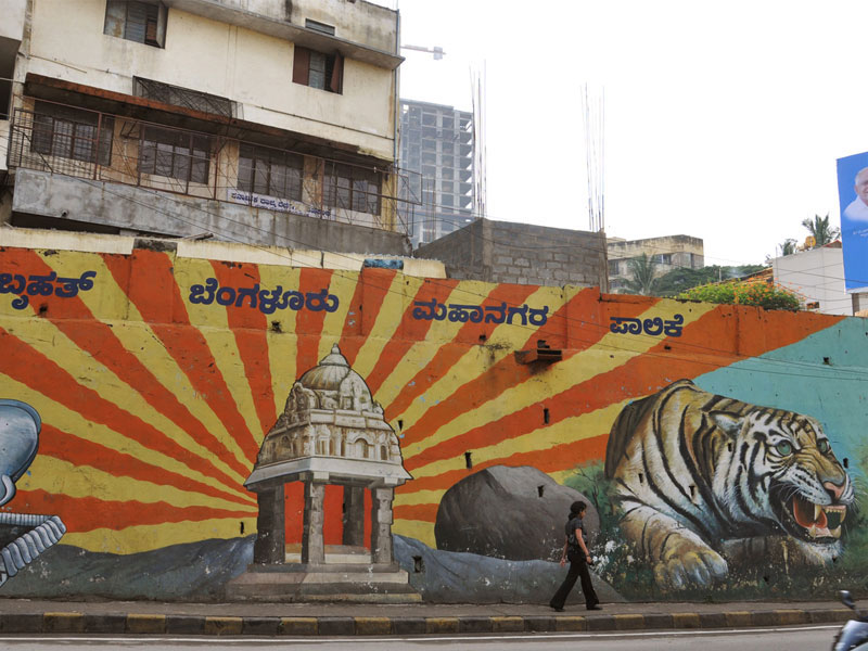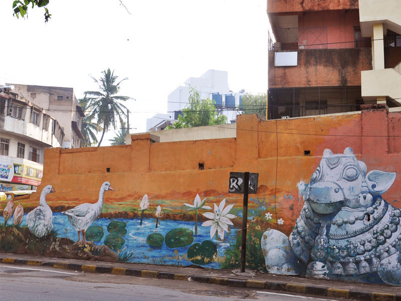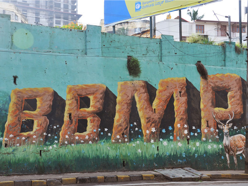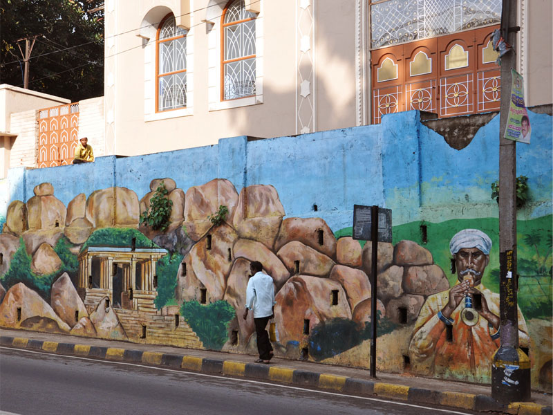 The Beauty of life-size Wall Art at Marathali Bridge: Two years ago, BruhatBengaluruMahanagarPalike (BBMP) initiated the project in collaboration with Bengaluru government to showcase Bengaluru's essence through big hand-painted wall art on street walls, bridges, outside educational organisations, government offices etc. A local group of painters belonging to 'Murugan Arts' (originally based in Chennai) was hired to execute the majestic hand-painted compositions. This archive presents a collection of the most prominent historic buildings, activities, flora and fauna of the city on the walls of one of the flyovers in the central part of Bengaluru city. The splendour in the massive appeal of forms, richness of colours and the identity of special places and moments of Bengaluru's history, culture and traditional activities creates a rich experiential interaction between the viewer's curiosity and the maker's aesthetics.