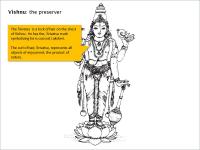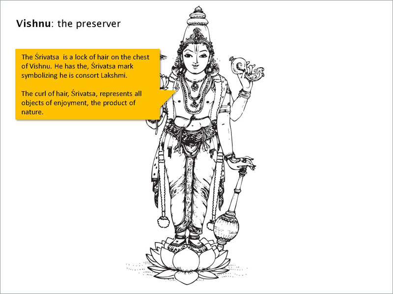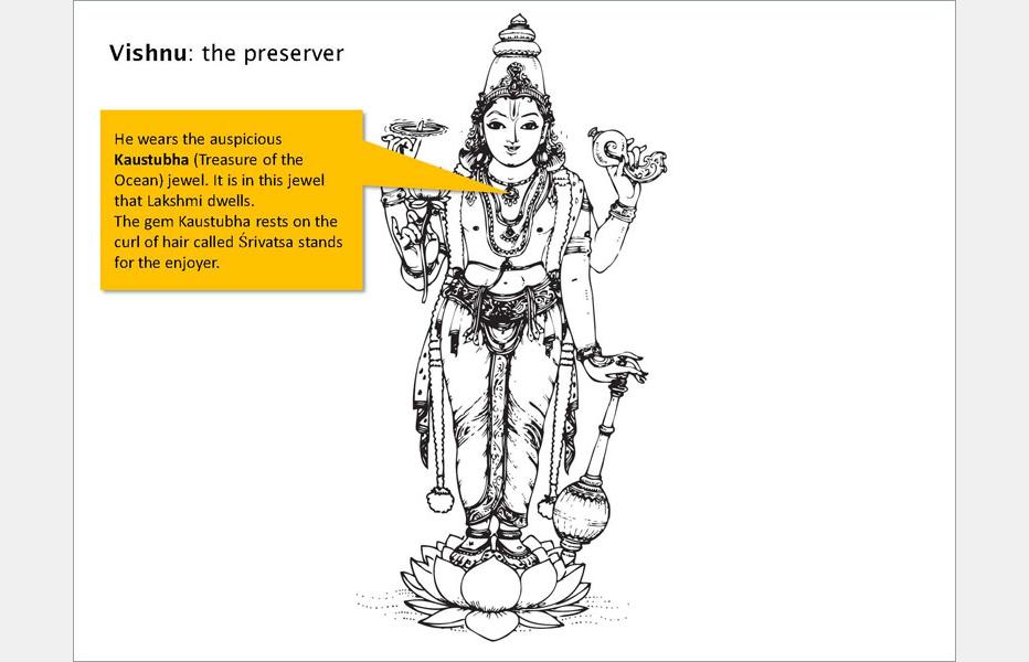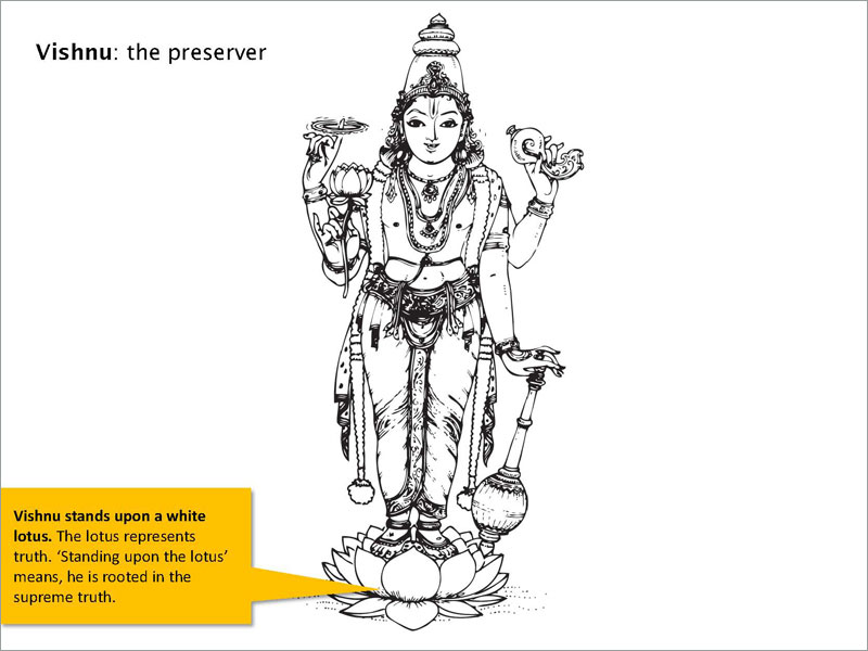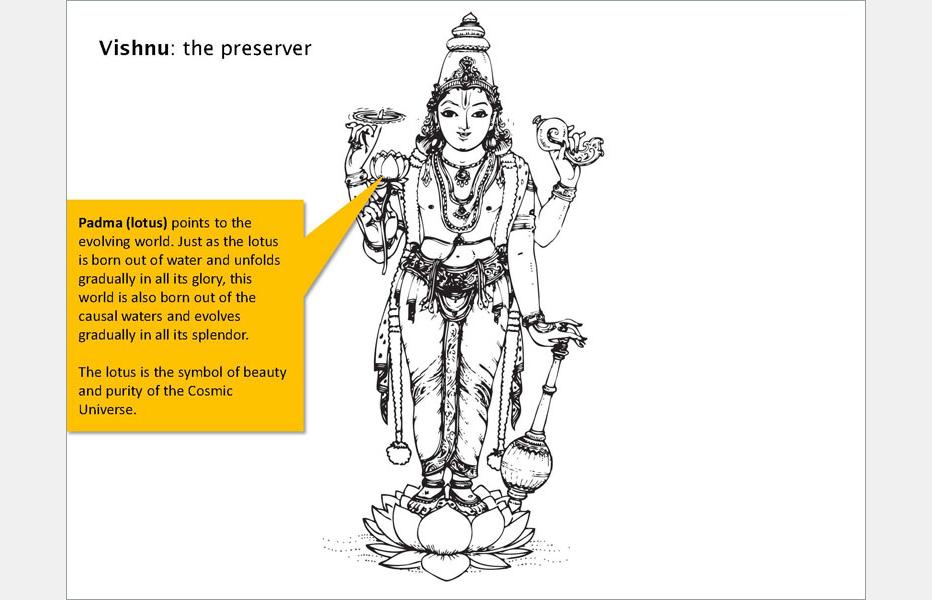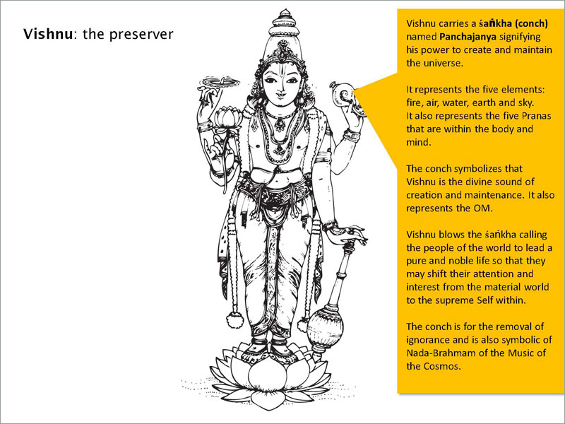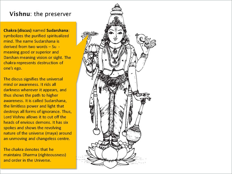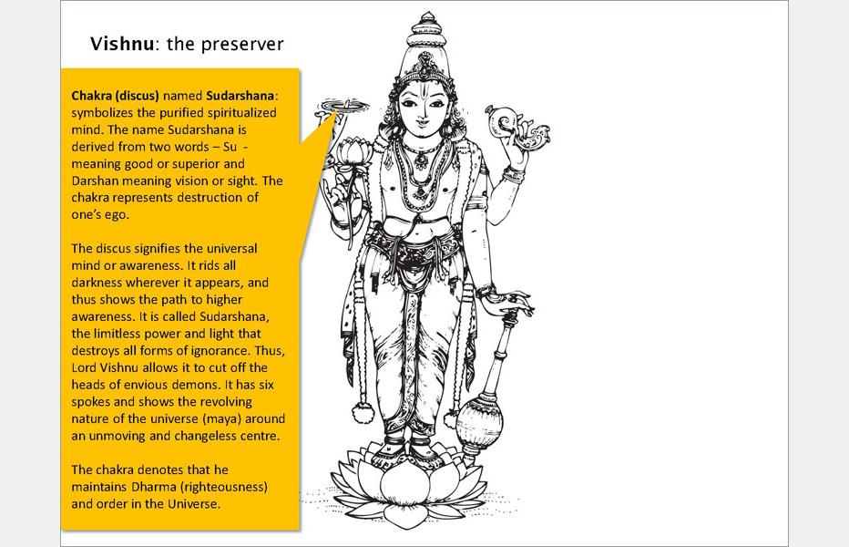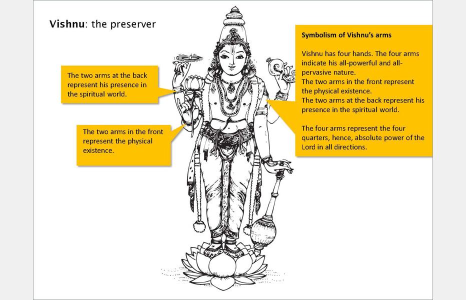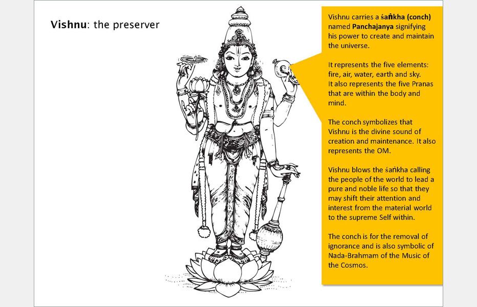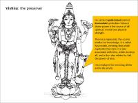 Imagery in Hinduism is preserved in its mythology. It is difficult to fully appreciate the iconography of images from the Hindu tradition without identifying with the philosophy behind it. A myth here is not easy to understand, but the code of myth can be broken by symbols. Symbols of a deity make up a pictorial script. Vishnu, is the second deity of the Hindu Trinity. He is responsible for the sustenance, protection and maintenance of the create universe. The word Vishnu means 'one who pervades, one who has entered into everything'. As a god who has the responsibility of maintenance, Vishnu requires lots of wealth; his consort therefore is Lakshmi – the goddess of wealth. The vehicle of Vishnu is a bird (eagle or hawk) or a half man half bird named Garuda , whose name means "Wings of Speech", a figure of great strength, power and piety.