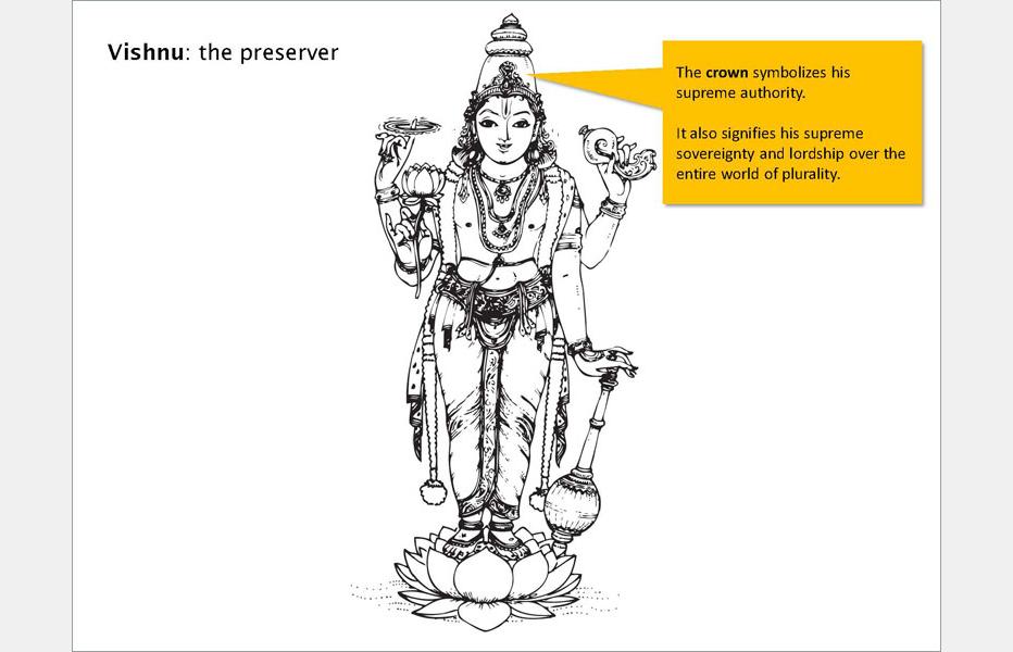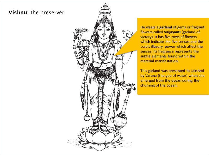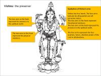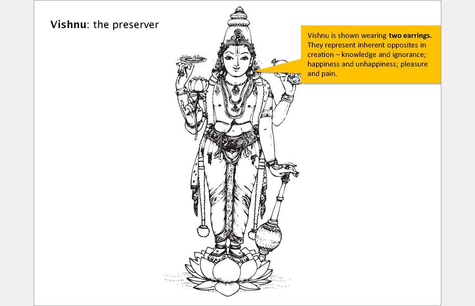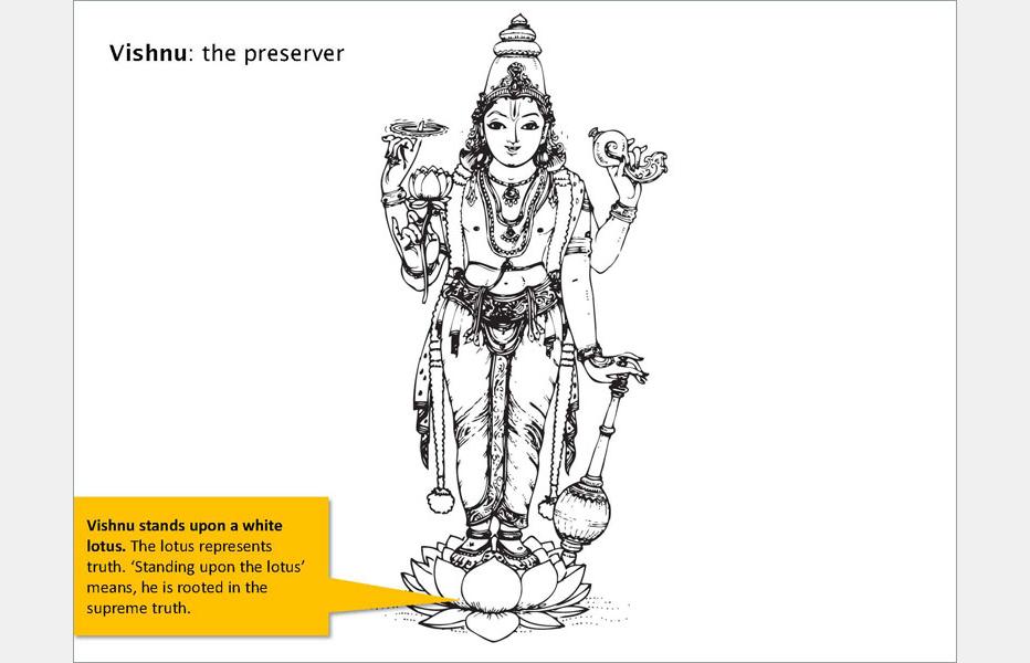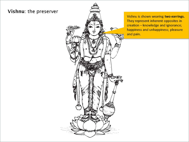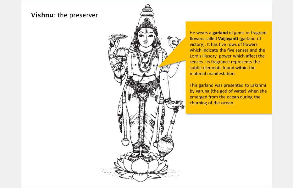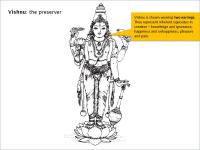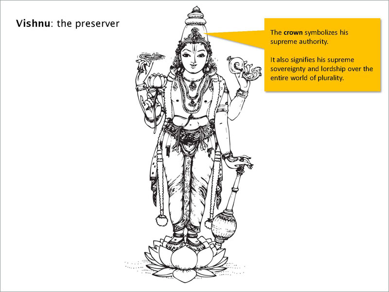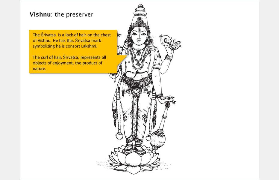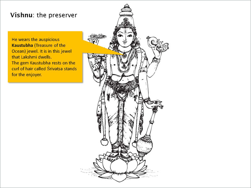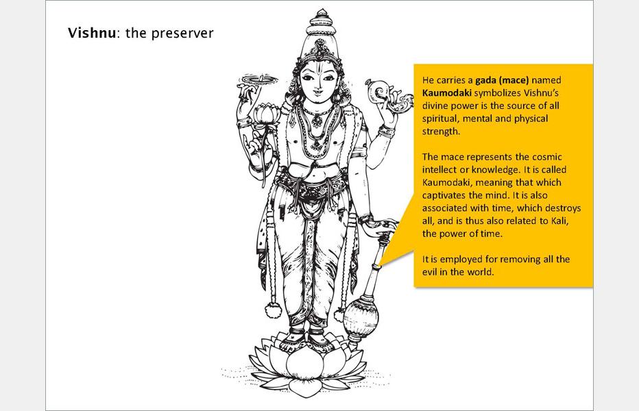 Imagery in Hinduism is preserved in its mythology. It is difficult to fully appreciate the iconography of images from the Hindu tradition without identifying with the philosophy behind it. A myth here is not easy to understand, but the code of myth can be broken by symbols. Symbols of a deity make up a pictorial script. Vishnu, is the second deity of the Hindu Trinity. He is responsible for the sustenance, protection and maintenance of the create universe. The word Vishnu means 'one who pervades, one who has entered into everything'. As a god who has the responsibility of maintenance, Vishnu requires lots of wealth; his consort therefore is Lakshmi – the goddess of wealth. The vehicle of Vishnu is a bird (eagle or hawk) or a half man half bird named Garuda , whose name means "Wings of Speech", a figure of great strength, power and piety.