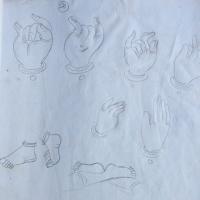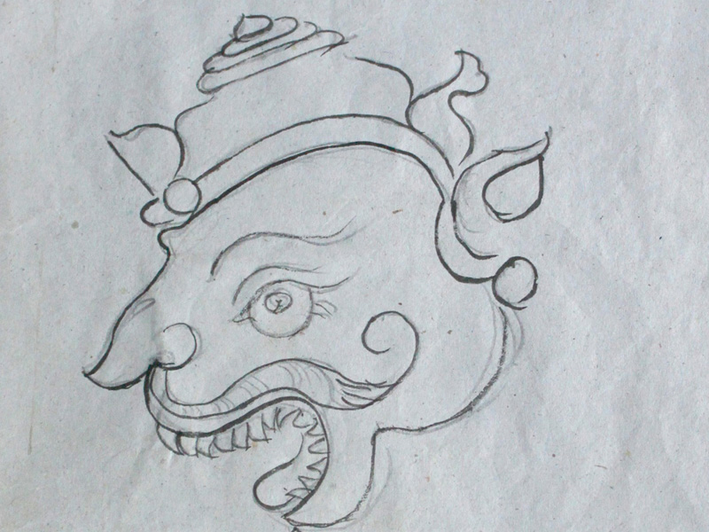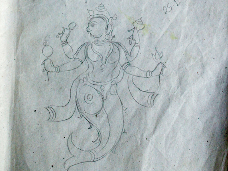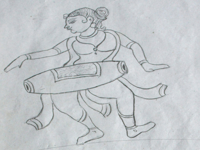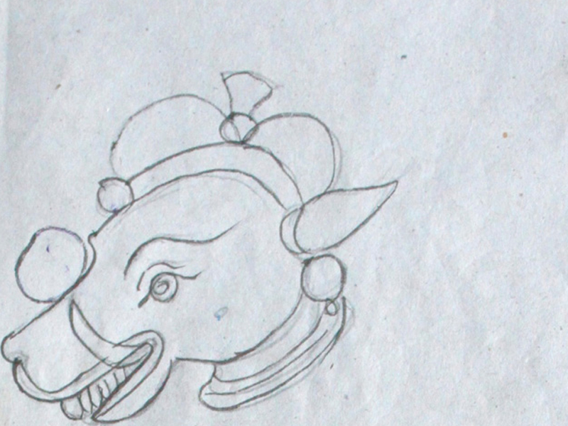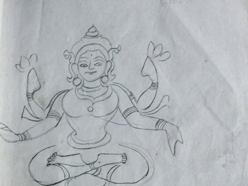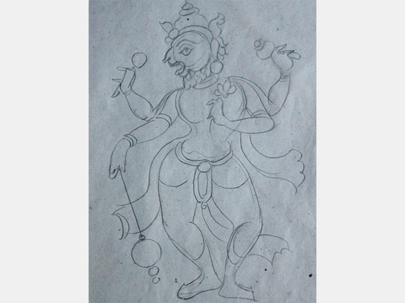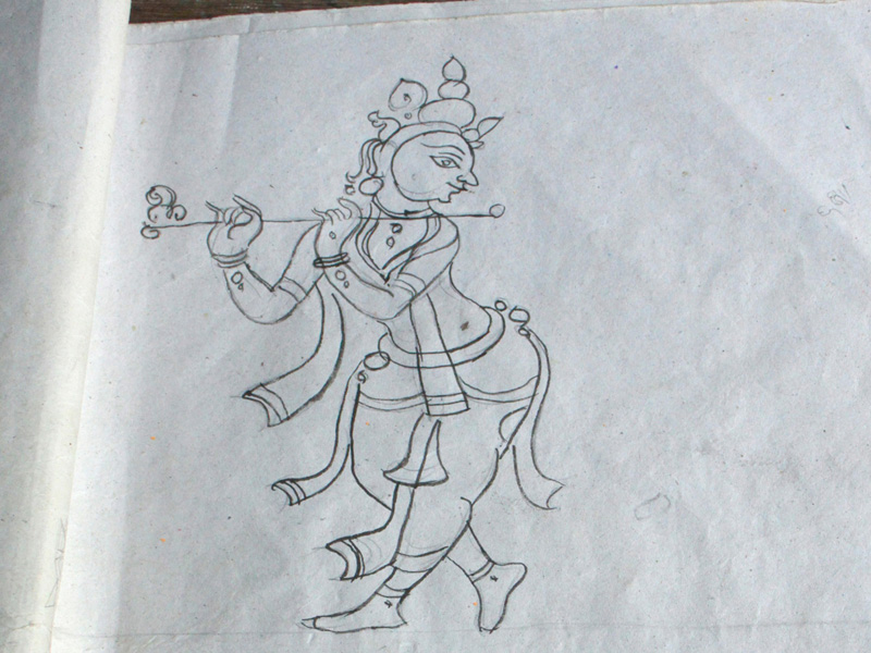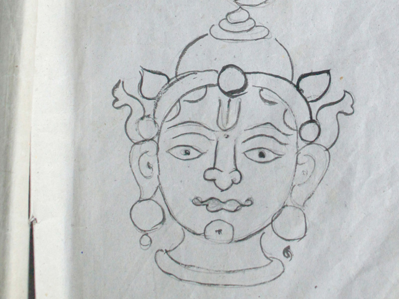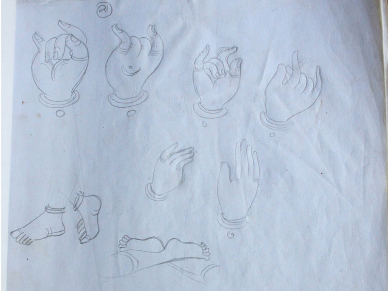 The Pattachitra artists or ‘Chitrakaars’ use different hand drawn sketches for reference and practice. These are handed over in the form of a family sketch book, over generations and cherished as a precious sacred possession. The younger artists are given rigorous training over years to internalize the style such that when they start practice, the typical features are maintained. When one becomes an expert in the field and start teaching and educating others he ensures that the new learners practice the same sketches which he had learnt from his teacher in the early stage of his career.