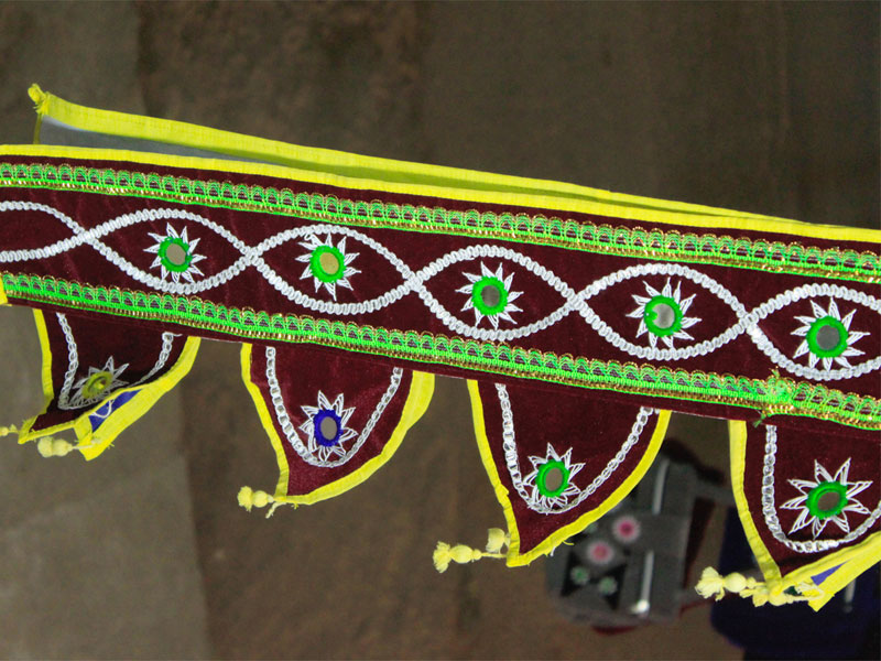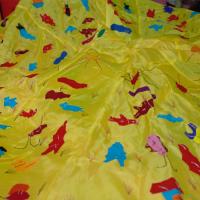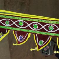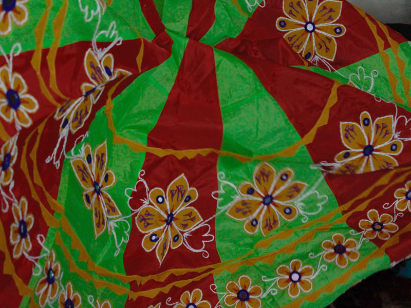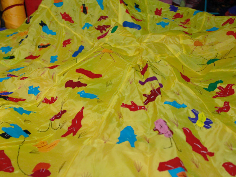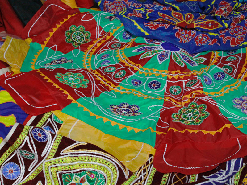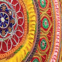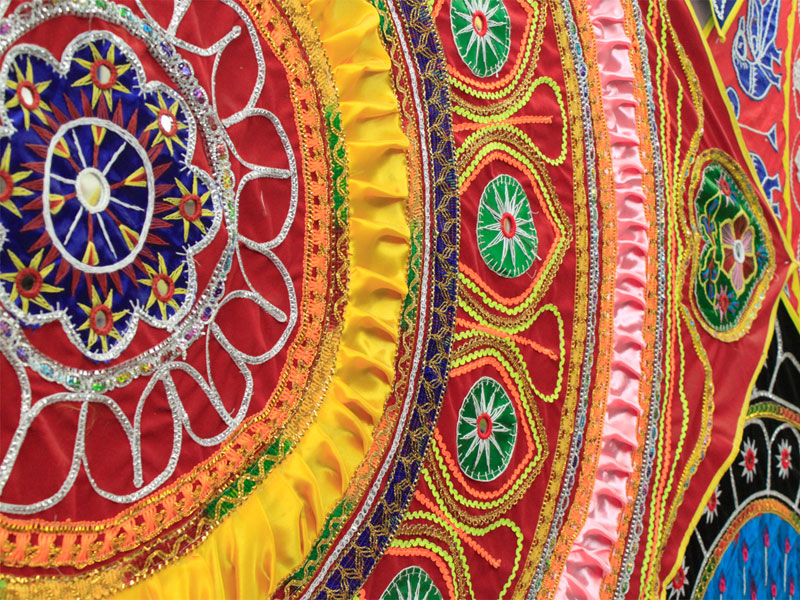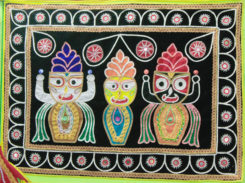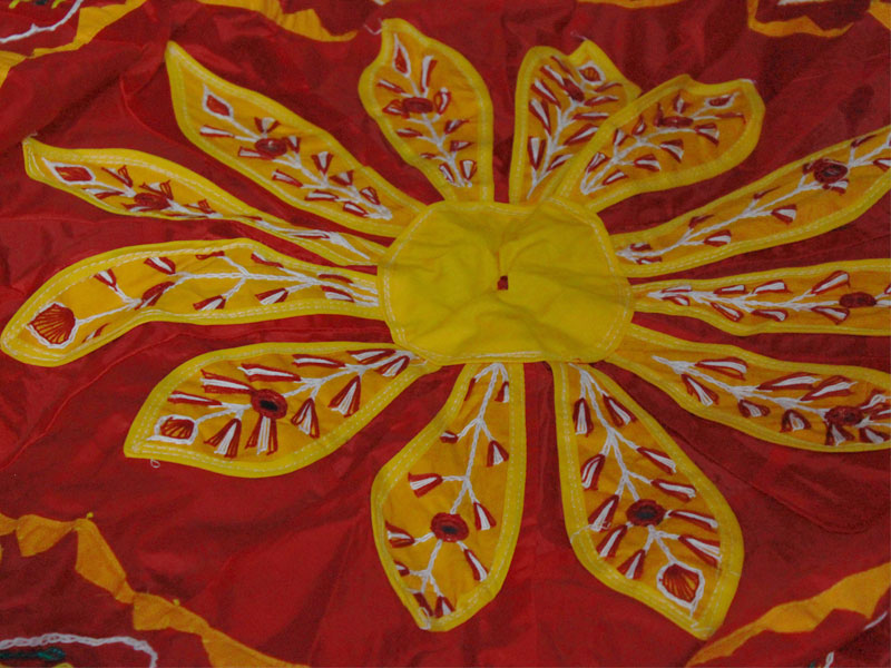 The famous town of Pipli in Orissa, halfway between Bhubaneswar and Puri, is known for its exquisite applique work. An enchanting form of fabric based patchwork, well known for its geometric motifs and stylized birds, animals and flowers cut out of brightly coloured cloth and sewn on contrasting backgrounds. The typical traditional motifs are varied yet fixed in their colours and representations. Motifs ranging from geometric, abstract, schematized actual life forms to stylized versions of social, natural, asteral and mythological characters and objects. The following slides take you through some of the colourful applique designs.
