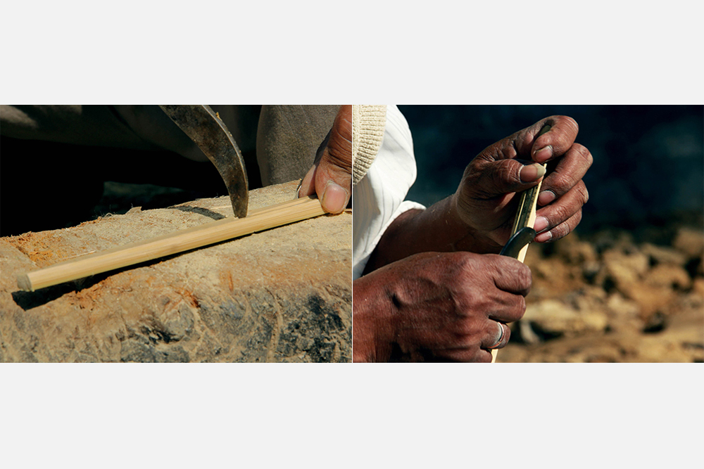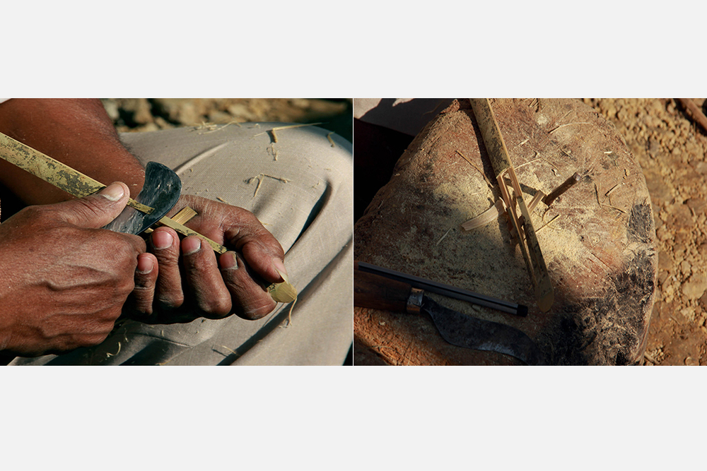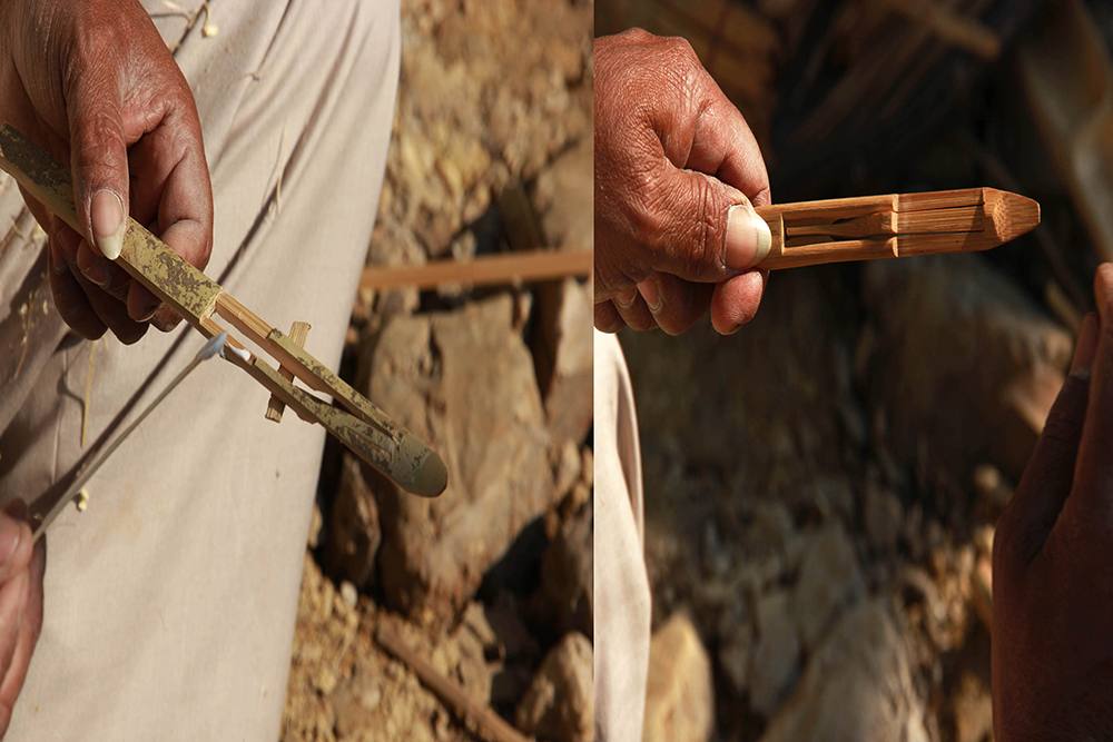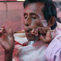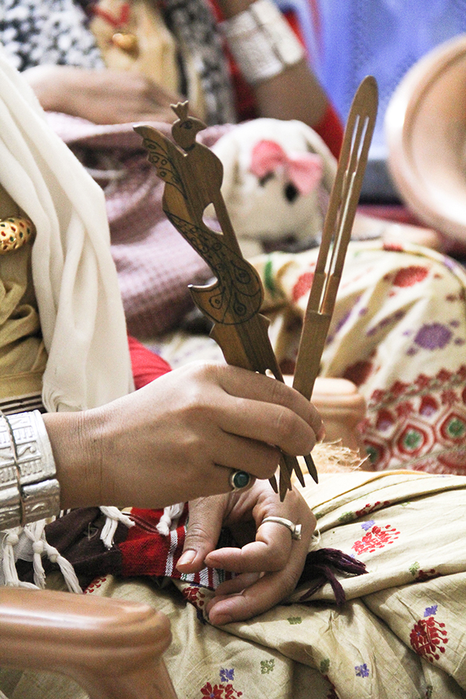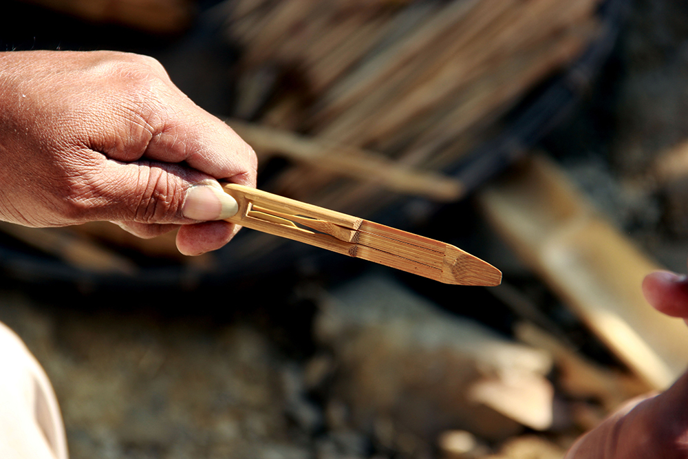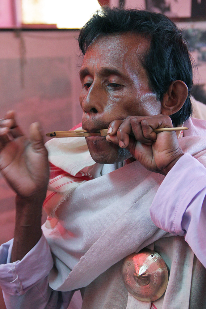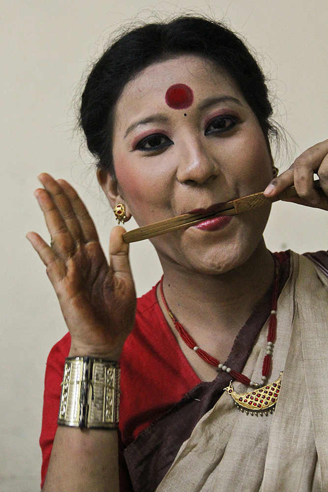 The Gogona is a type of jaw harp, a vibrating reed instrument that is used primarily in the traditional Bihu music in Assam. It is made of a piece of bamboo that has a bifurcation on one end. The solid end is gripped with the teeth and the free ends are then struck repeatedly with the fingers to emit the distinctive sound of Gogona.