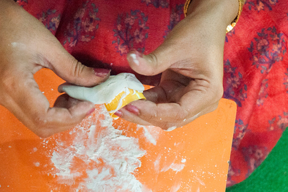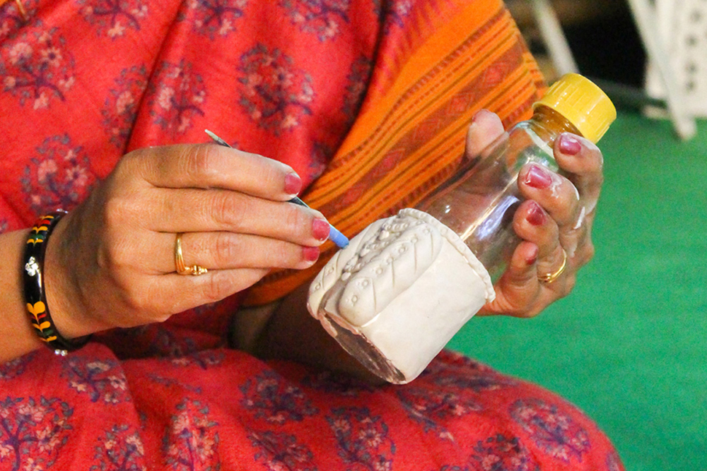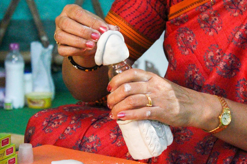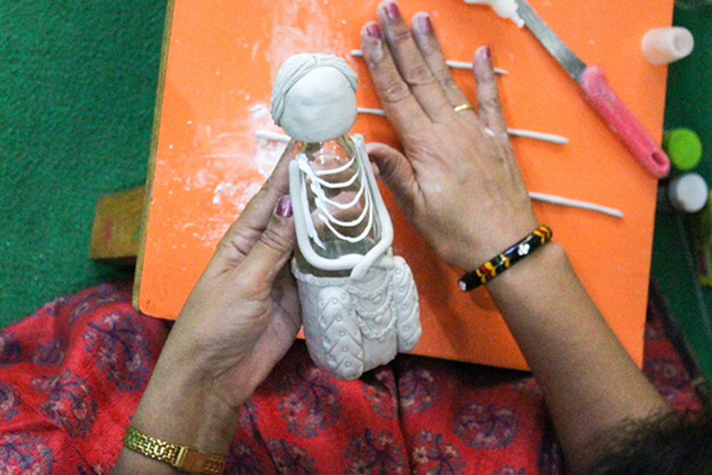 She is the owner cum trainer at the Creative Craft, Nagpur, who runs the art center for 22 years. She is a proud recipient of the Kamagra Mahila Sangathan award. A Marathi newspaper, ‘Maharashtra Times’, organized a workshop for the artisan to teach handicrafts for women in Nagpur, where Mrs. Vaishali was also invited. This art requires very minimal material such as M-Seal, empty ketchup bottle, acrylic paints, and adhesive. Knife and pen are used to give shapes and designs.