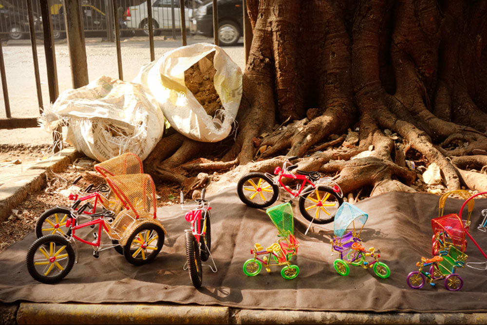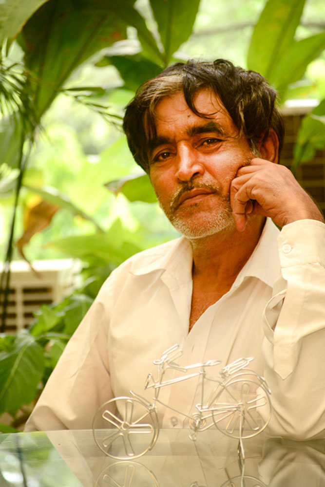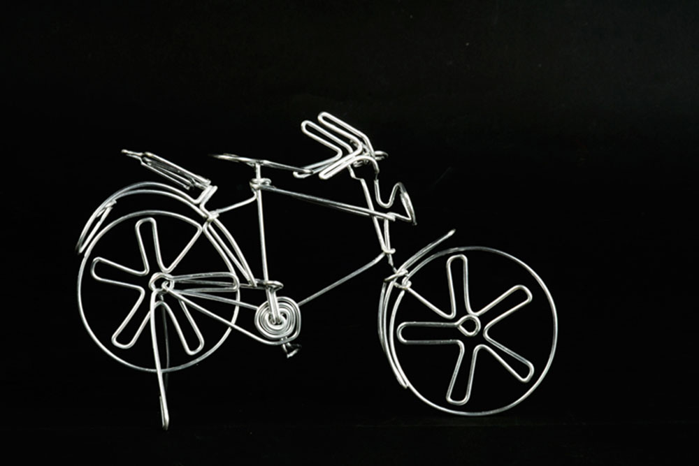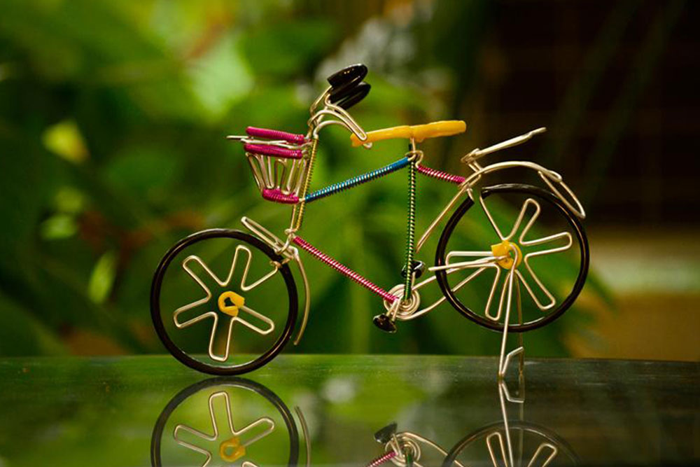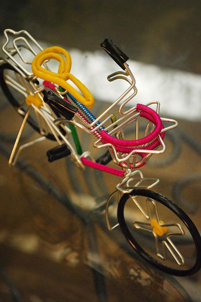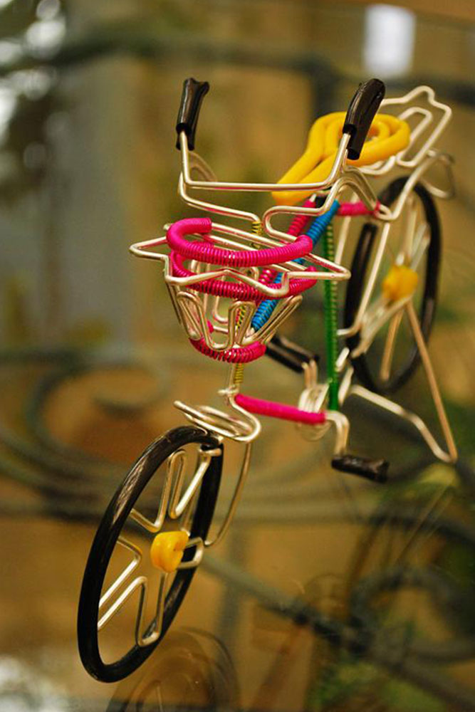 Wandering on to the streets of South Mumbai one could easily spot the colorful models made out of single wire on display. This strange yet beautiful looking artwork varies from colorful bicycles, motorbikes, and rickshaws to animal figures and faces of gods. The art of wire bending may find its traces in the ancient wire sculpted jewelry, which is believed to originate over 5000 years ago and practiced by Egyptian and Phoenician artists. However the street art of Mumbai is very urban and is born out of need of its people to find opportunity in anything and everything in the maximum city. Harish Kumar Bhanushali is one such artist, who is famous for his street art, the models he makes out of single metal wire.