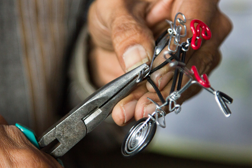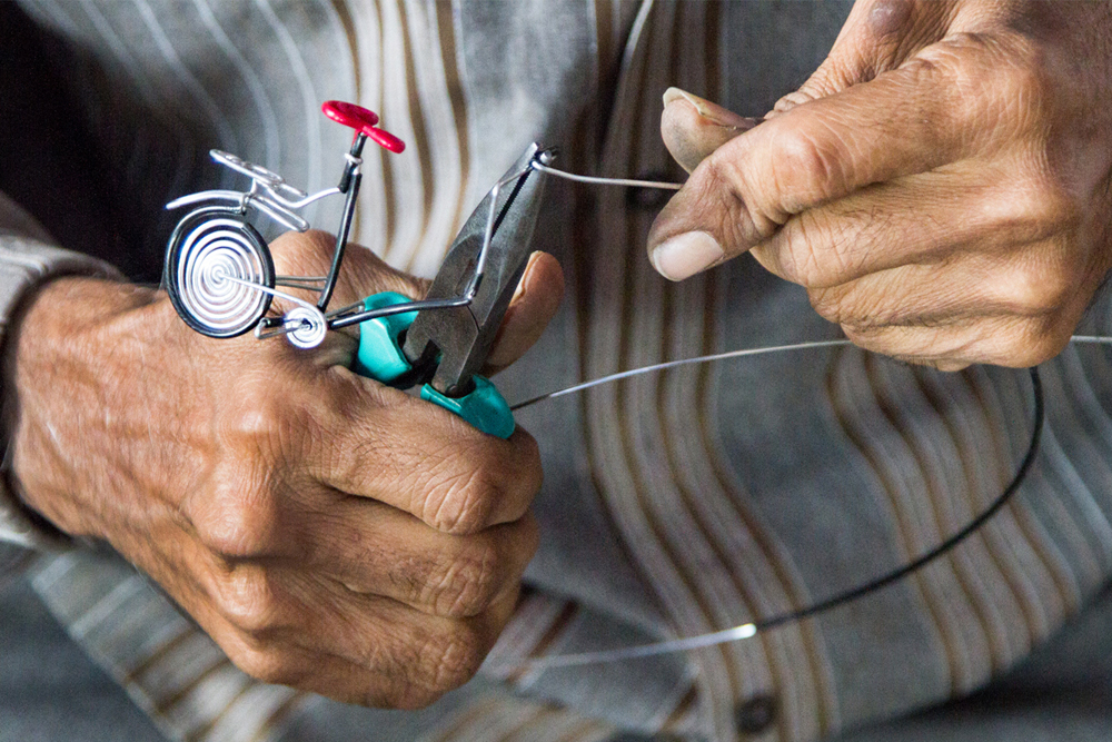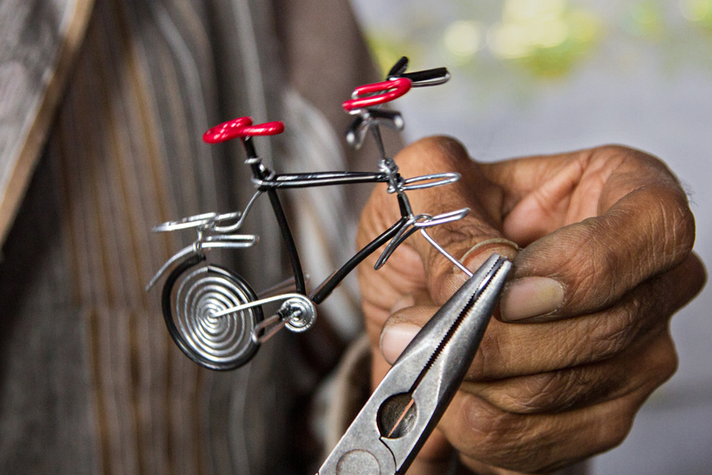 Rathod Girdharbhai Hamirbhai a skillful artist of the Single wire craft is a resident of Ahmedabad, Gujarat. Previously he used to earn his living by making jute dolls where he used wires to support them and sell them on the footpath.