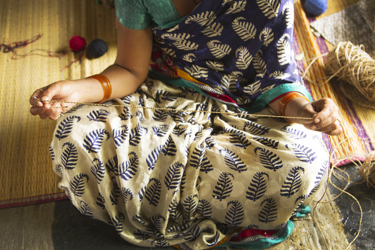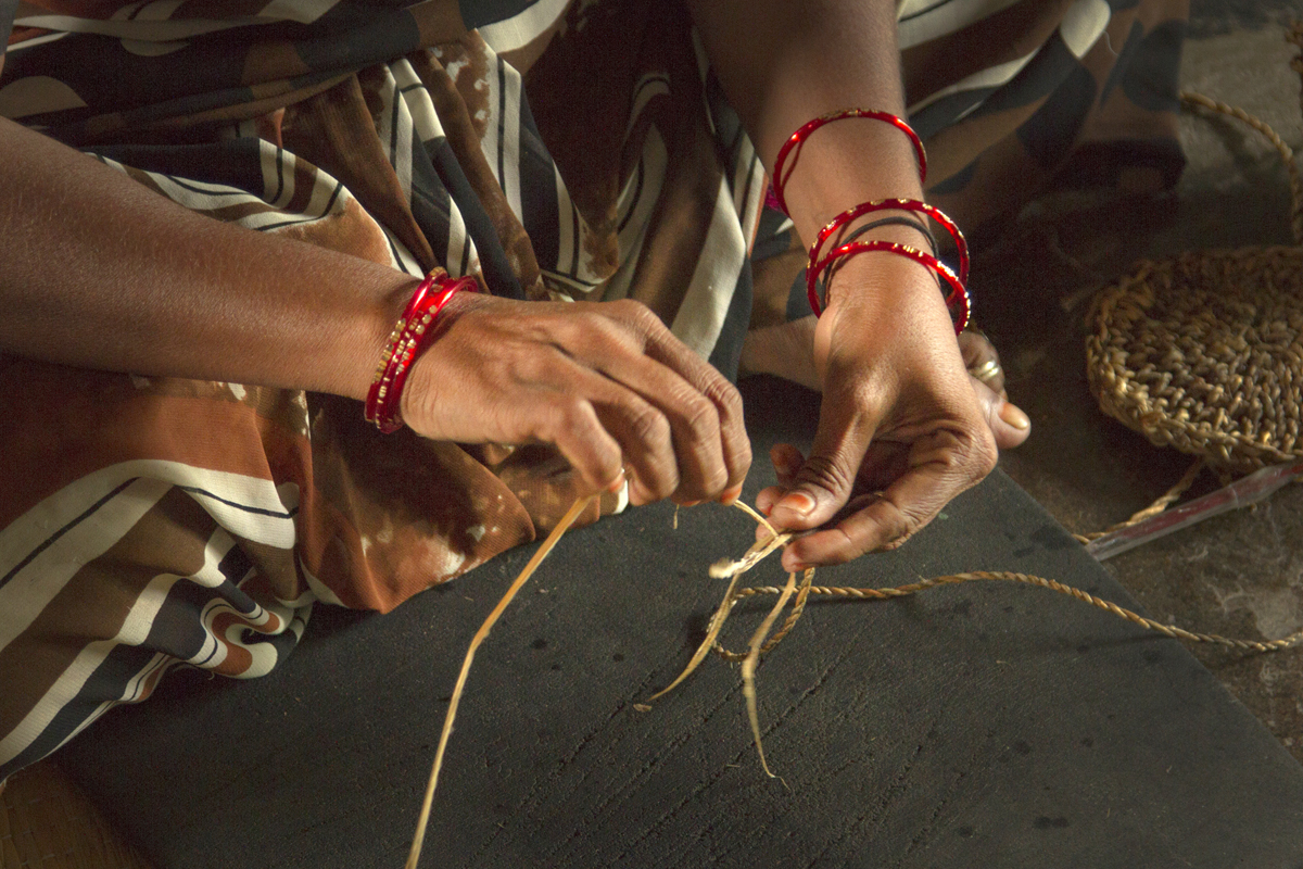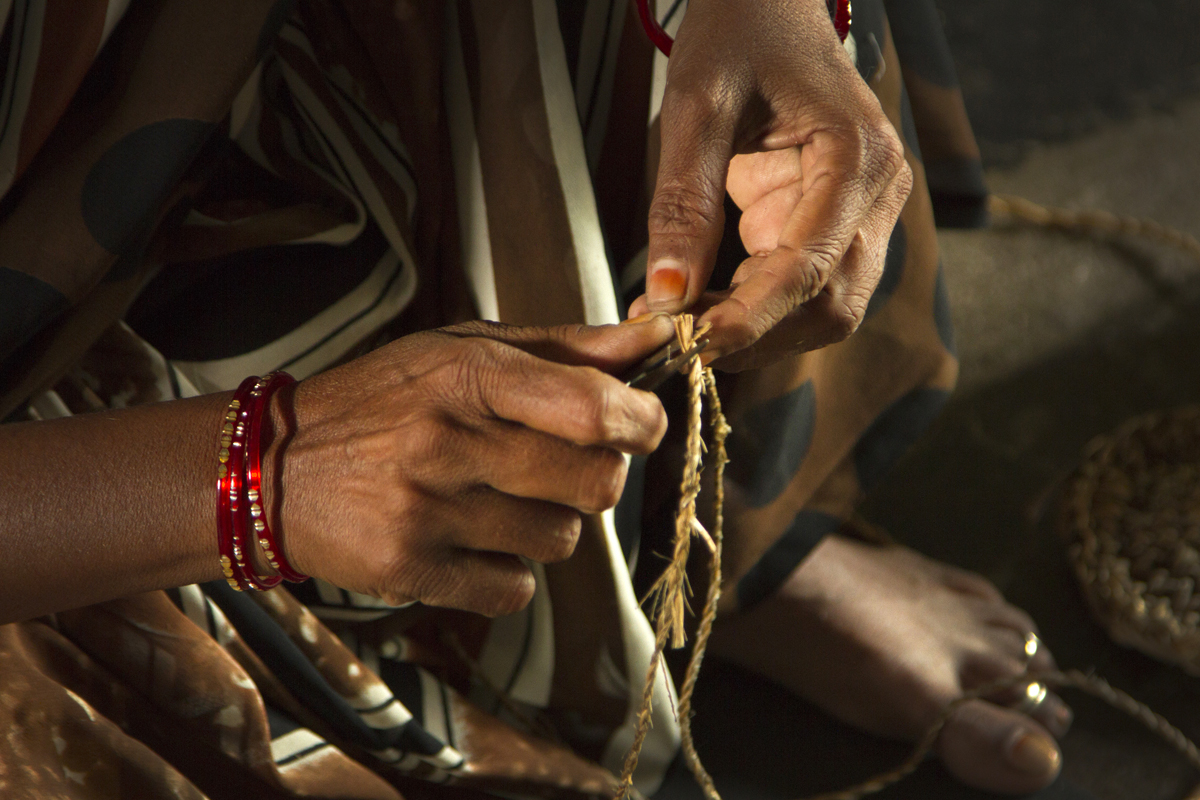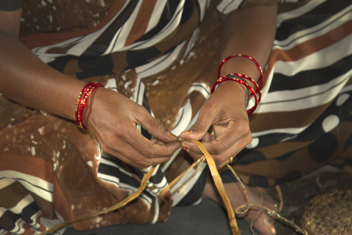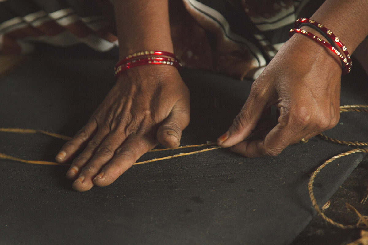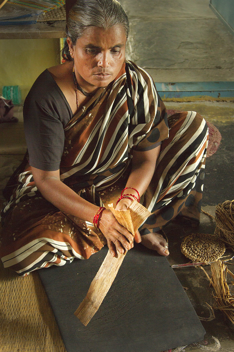 The thrown away stem of banana plant, after extracting the fruit & leafs are dried in sun, naturally, after which it becomes golden yellow or brown, after the drying is completed, it is peeled in two separate pieces, the one with less thickness is thrown away, as it does not have required strength to make rope strands. The thicker piece goes into further processing of peeling away thin strands, as this is done it is soaked in water to soften it, so that it can be handled with hands and would not leave any scratches on it. It is then taken 2 to 3 or more (depending on the thickness of rope) at a time and is rubbed with bare hands on a textured rubber mat, such that it forms a single durable fiber which can be used for weaving.