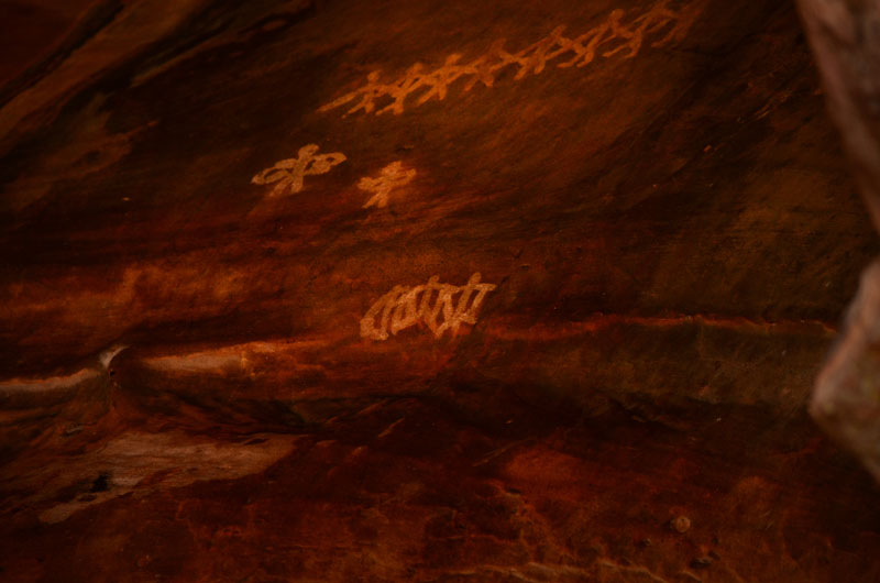 This shelter comprises of beautifully designed, natural looking animal figures in white color. The figures of dancers, drummers and horse riders can be seen. The paintings have three different layers of superimpositions, with the earlier ones faintly visible. The drawing of eight stick-shaped men dancing arm in arm, a dancer and another group of three dancers are drawn here. One more group of illustration comprises fourteen figures of dancers and one figure of a drummer. The dancers are shown with joined arms in three groups of eight, four, and two, and the drummer holding a drum with broad ends is painted above the dancers. Below this depiction, are two isolated human figures, two human figures on a horse followed by three individuals.