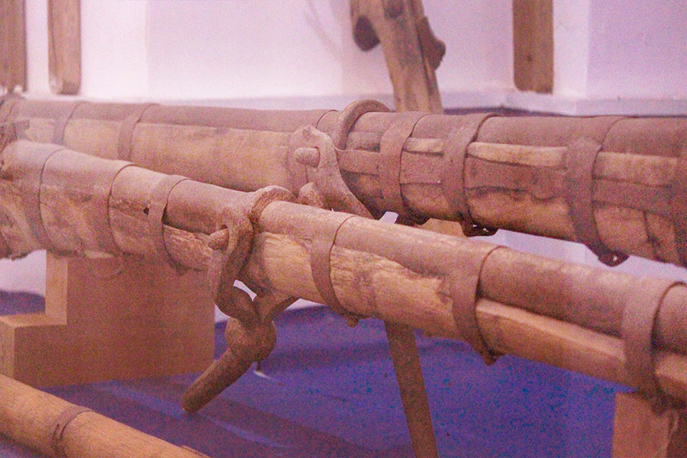 With the invention of Gunpowder in China at around the 9th century CE, the approach to fighting across the world shifted drastically, changing all the existing notions. The invention was then followed by new ways to use projectile weapons initially, later ending with the development of cannons, used extensively from the 13th Century CE. Sultan Muhammad Shah of the Bahmani dynasty was found to use gun powder during the siege of Belgaum in 1473 CE. King Babur, the pioneer of the Mughal dynasty in India, also encouraged improved artilleries, which led to his overthrow of Sultan Ibrahim Lodhi of Delhi. The forts in Karnataka, Bidar, Mudgal, and Bijapur are known for their large varieties of cannons dating back to 16-17th century CE, indicating their inevitable role in protection, capable of firing huge iron balls with the use of a large amount of gunpowder. They also exhibit types of ancient battle guns, with the capacity to hurl iron balls to a considerable distance. Small muzzle cannons raised on wooden trolleys and furnace wielded cannons, largely underlines the excellence of Indian metal casters and Blacksmiths, even during a period devoid of mechanization. The iron balls found from the site bear a diameter less than the bore size of the cannon from which it is fired. Here the iron balls possess varied diameters while cannons exhibit both differing lengths as well as diameters. These cannonballs measure, on an average 18cm in height and 55cm in circumference.