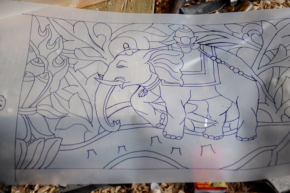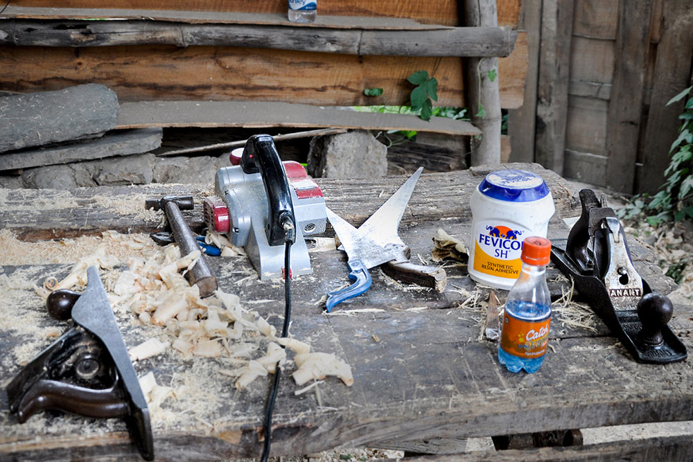 Tools and raw materials that are used for the Buddhist woodcarvings are: