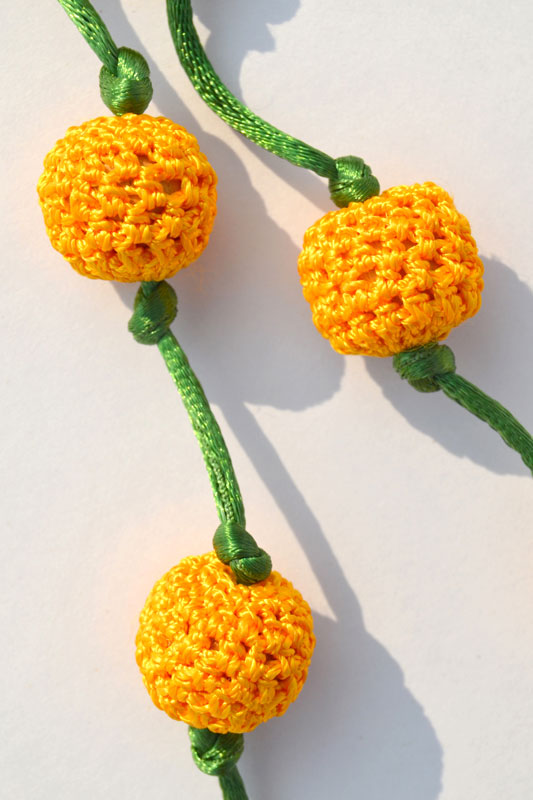 Samoolam’s current range of products includes hair clips, buttons, loop earrings, tops, dangling earrings, jooda pins, brooches, long necklaces, chokers and bookmarks. The women are currently working on a waste recycling project (crochet covers for old glass jars) and a festive range for Christmas (hangings like stars and balls for the Christmas tree). The packaging of the products is done very thoughtfully as well. It’s a white organdypotli bag with a Bodhi leaf embroidered on it, very symbolic of Gaya!