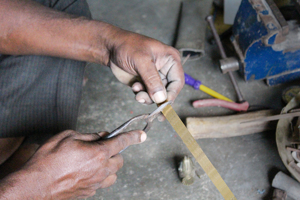 • A piece of the brass sheet is made into a conical shape to make the head of the fish. This is done with the help of a metal rod, which is used as a mold on which the brass sheet is beaten.