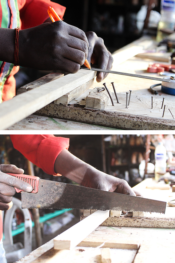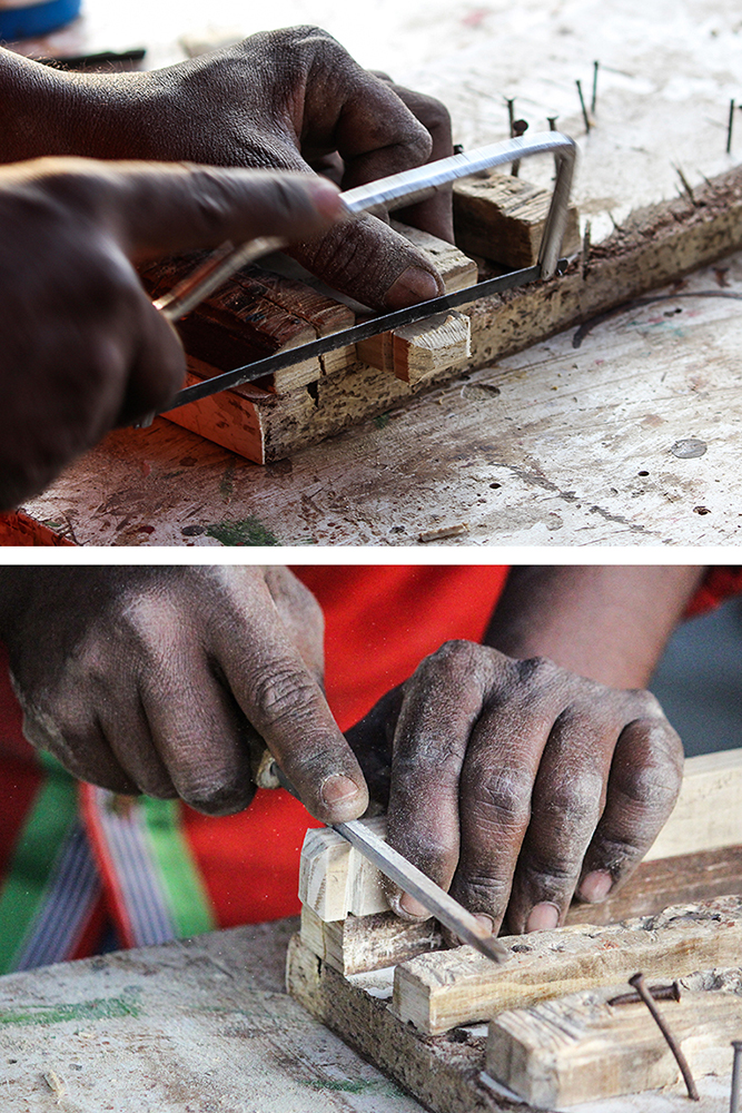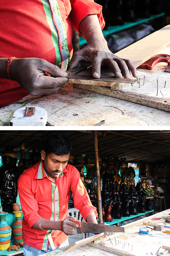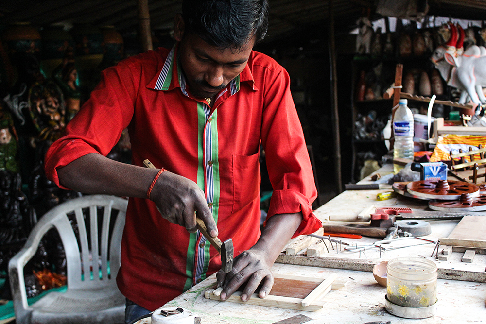 The process starts by making the base of the cart. Artisan uses try square and marks on a wooden slab where the wood has to be cut. Hacksaw is used to manually cut the marked areas. He takes a smaller sized wooden stick, marks and cuts the same (set 1). Carpenter plane is used to shave off the surface of the wood (set 1) and make it even. Round file is used next to shape the wood accordingly. The artisan takes two more pieces of wood (set 2) and chisels out one corner of the wooden sticks and files the chiseled place to make the corners smooth; to the other corner he cuts a little of wood slightly away from the edge with the saw. (set 1) wooden sticks are stuck using adhesive on the wooden block facing upwards on opposite sides. To make these more secure he pounds them with nails using hammer on two sides. (Set 2) wooden sticks are stuck on the sides of the wooden block, opposite to set 1 wooden sticks so that the corners of set 2 sticks come below set 1. He strengthens the fix by striking with nails using hammer. The base of the cart is ready.