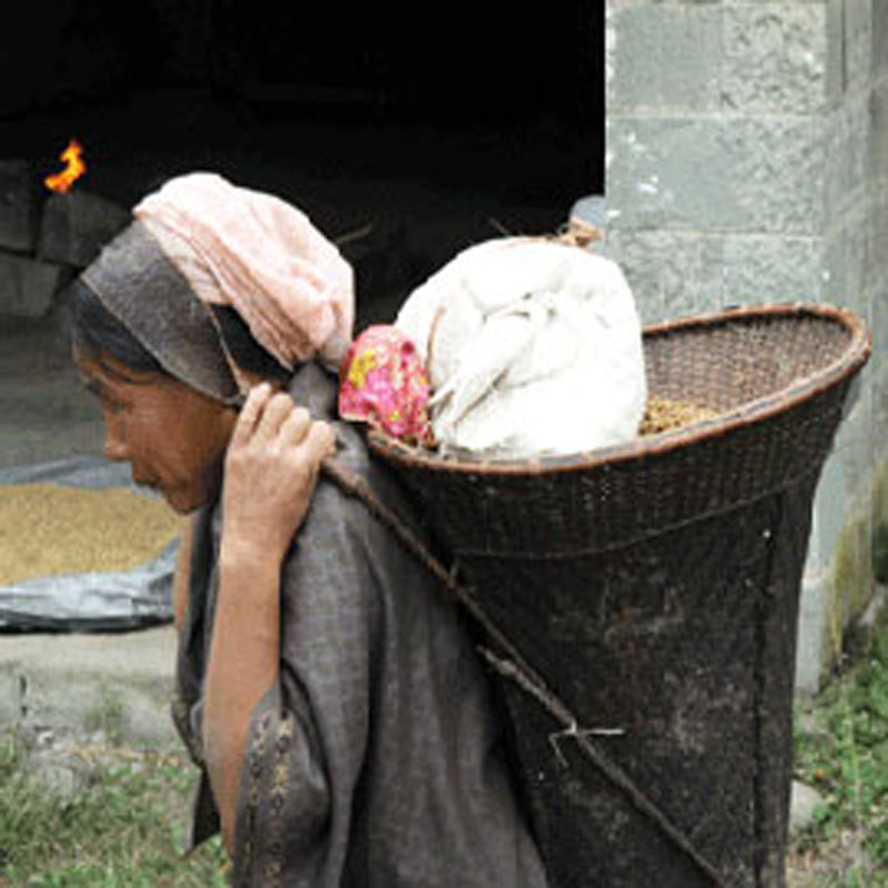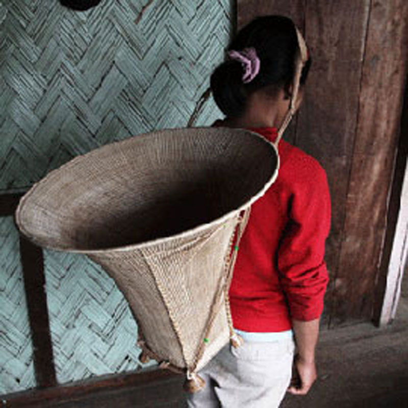 As these baskets have a conical shape with a wide mouth, the easiest way to carry them in the uneven terrain of Nagaland, is to wear a strap around one’s head that is attached to the basket. While carrying the basket in this manner the body is often inclined following the gradient of the hill.