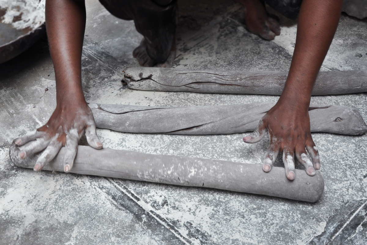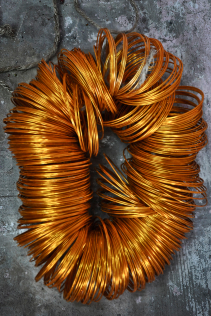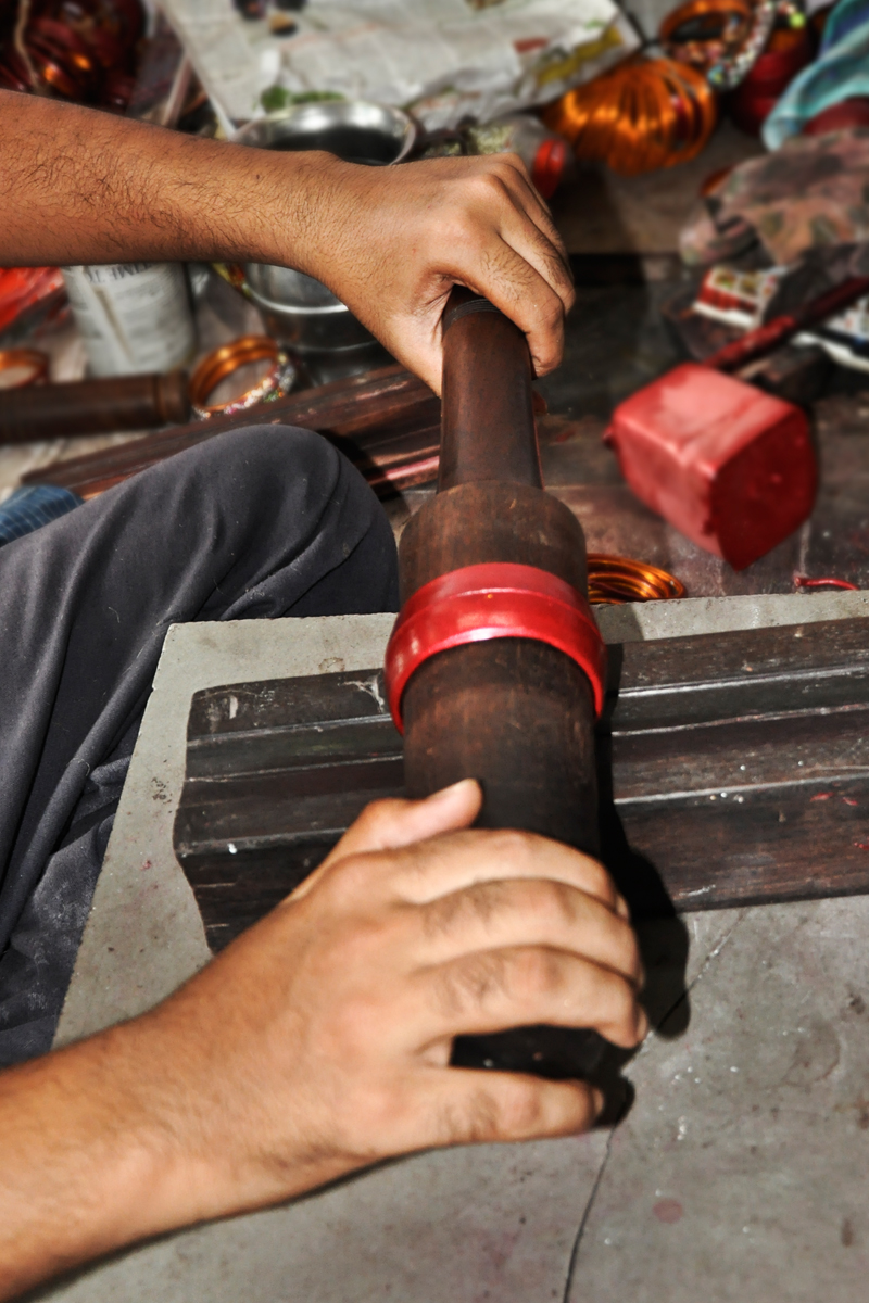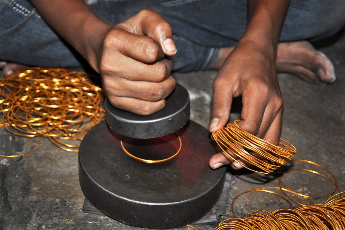 Normal lac is stuck/pasted thickly on a wooden rod and rolled over a flat surface to make it into a cylindrical shape. This lac is then heated slowly over the coal burner. The heated lac is continuously pressed and rolled over the flat iron plate with the help of wooden tool. The colored lac is heated simultaneously and then applied evenly by rubbing it on the lac. Once the color has been applied to the lac base it is again shaped into a thin coil and cut off from the plain lac rod. The width of the bangle varies as per the design incorporated on the bangle. Brass or steel is used as base for the lac. The metals are first converted in the shape of the bangles and the thin lac coil is rolled on the brass or steel base. For a thin lac bangle 3 thin brass bangles are kept together and on that lac coil is rolled, incase of steel base, the base thickness is made according to the required width of the bangle. The thickness and the length of the coil approximately depend on the final shape and size of the bangles. The semi-finished bangle is slipped into a round wooden beam with a tapering end for adjusting to the proper shape. The bangles are kept aside for drying.