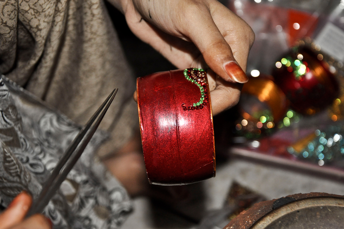 The bangles are normally embellished with pearls, semi-precious stones, mirrors, beads etc. For applying the stones, they are heated over a tin plate kept on a small burner. The base of the stones gets heated and easily melts the lac surface on which they are placed and stick there after cooling. They are picked up one at a time and stuck on the bangle. The process requires great precision. The women members of the artisan’s family do the embellishments.