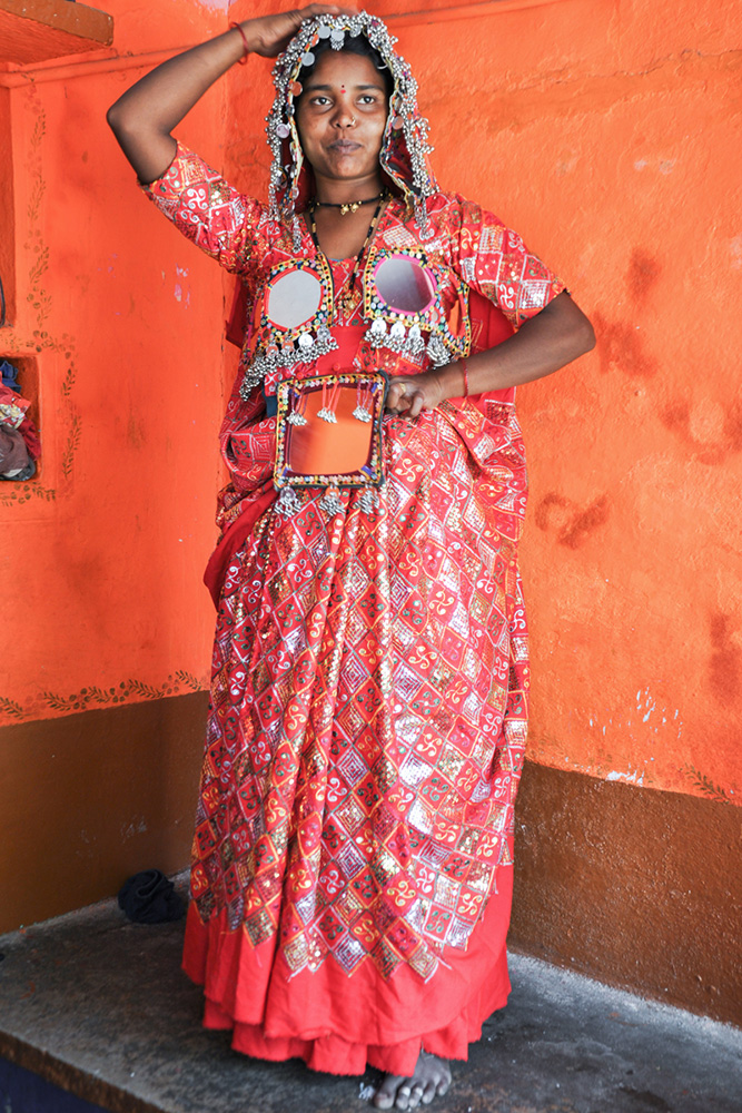 Lambani embroidery is combined with mirror work that enhances the colour and glitter at the integral parts of the Lambani costume. The embroidery is also done on various household accessories.