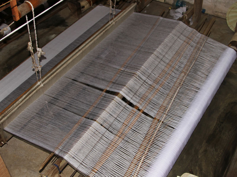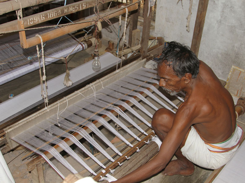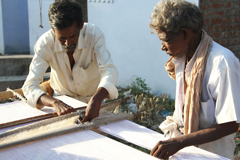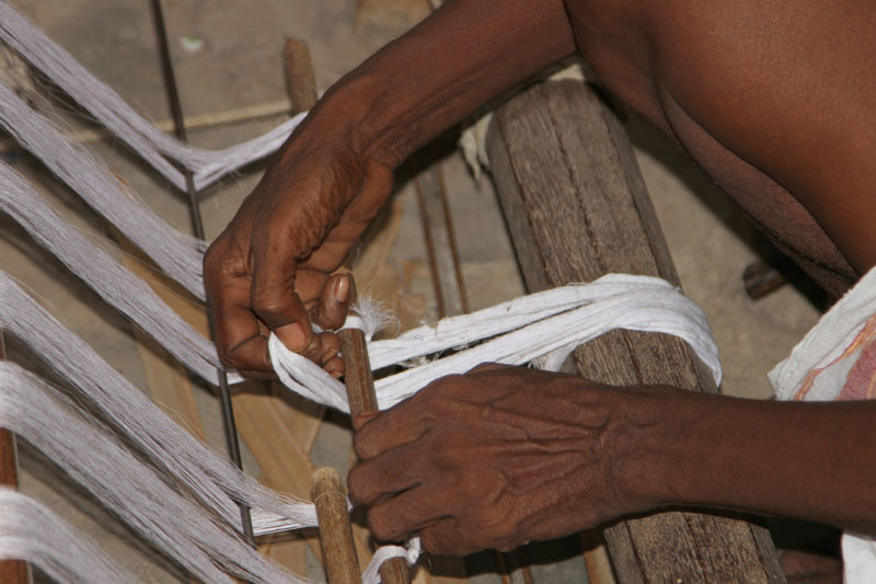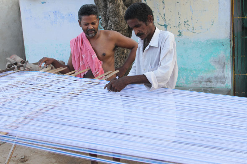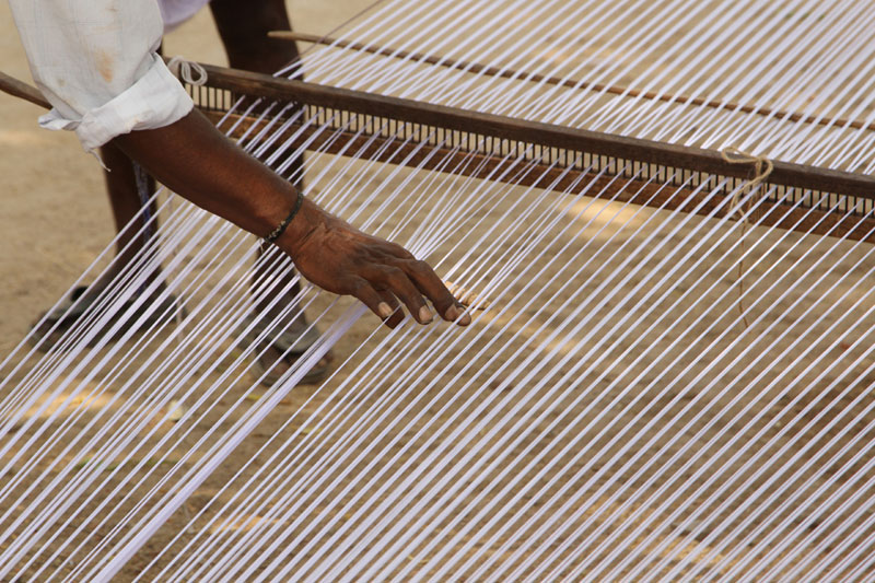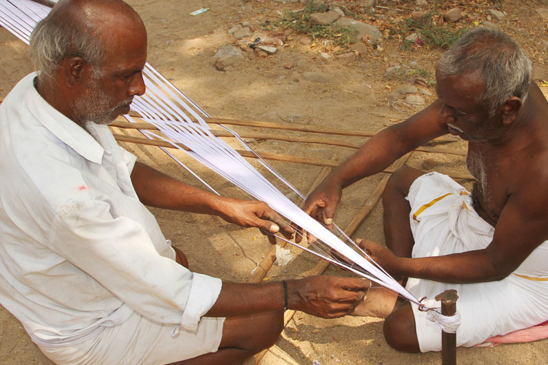 Warping process is done to prepare the lengthy warp which is later loaded into the loom for weaving. This process is done early morning in the village streets so that they can avoid thread breakages caused by excess heat. Warp threads are stretched and ends are tied between two poles. Artisan examines for breakages and entangles in the warp. Entangles are cleared and breaks are knotted. The warp is sized to make all the threads even. Prepared warp is rolled and loaded into the loom.