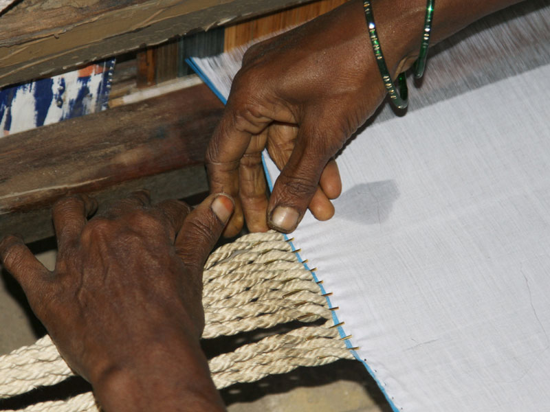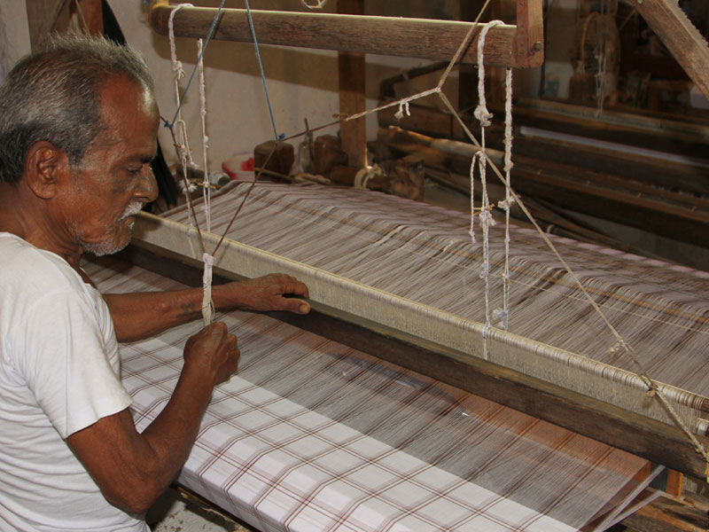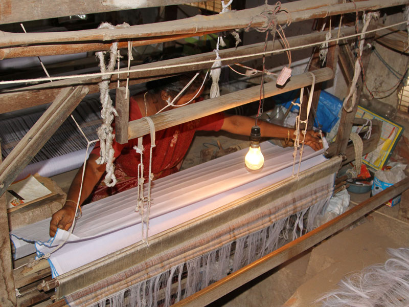 Weaving Process: Weaving process is initiated after warping. Each thread from warp is attached to the loom threads which are left intentionally from the old warp. Generally, women take care of knotting process. Once knotting is done, the warp is ready for weaving. The weave is formed by interlacing the warp and the weft. The warp threads are processed with fly-shuttle with a cotton spindle loaded in it. The fly-shuttle travels from one end to another end, thus the weave formed by beating the wooden frame which is in front of the weaver. The formed weave is wounded to a wooden beam. The length of unwoven warp is left purposely at the starting of weaving and completion of one Lungi weaving. On completion of weaving the Lungiis folded traditionally and kept ready for marketing.