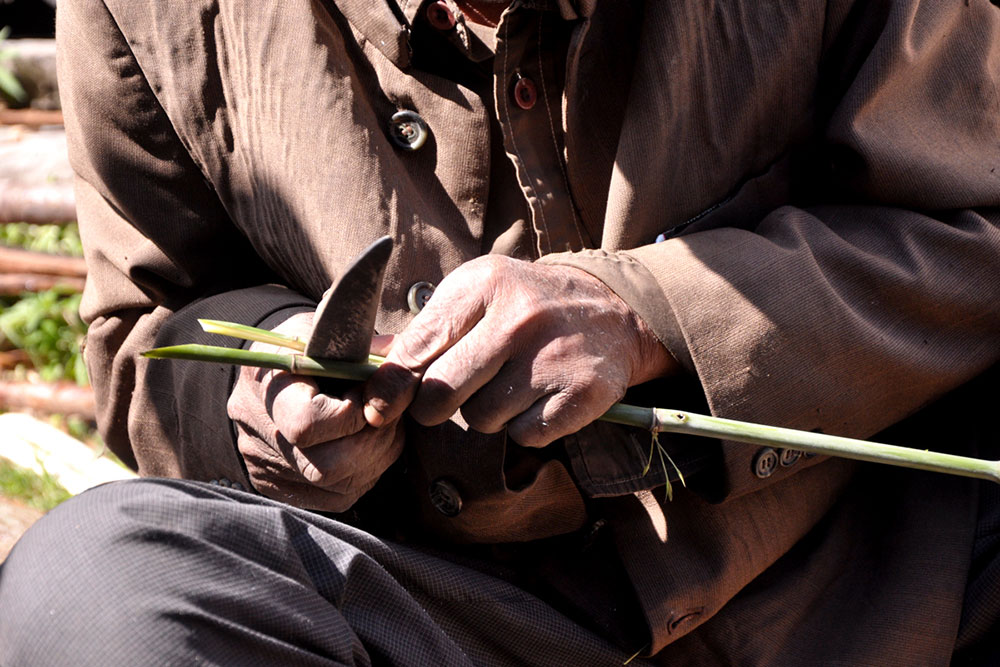 Kilta is made using bamboo, which is locally available. Different types of bamboo plants like Nargal and Toong are used in basket making. Bamboo, which is 3-4 years old, is cut down from the nearby forests, and the leaves are stripped using a knife known as Chakku. The bamboo is split and cut into the required length and width, depending on the size of the basket. The size of the bamboo strip is around half to one and half-inch in width and four to six feet in length. Splitting is done manually with the help of the knife. For making the base, thick bamboo strips are circularly arranged on the ground in such a way that the mid-point of the bamboo sticks (across the length) are touching each other. Thin strips are weaved by overlapping the base strips. The weaving happens from the bottom of the basket and progresses upwards. The technique used to weave the baskets varies according to the type of basket woven. Baskets like Dhalara, Chabdi, etc., are made using bamboo strips. Techniques like coiling, interlacing, and plaiting are commonly used in making these baskets. Once the weaving is complete, the ends are folded inwards and locked. The basket is ready for use. Women weavers make items for domestic use throughout the year.