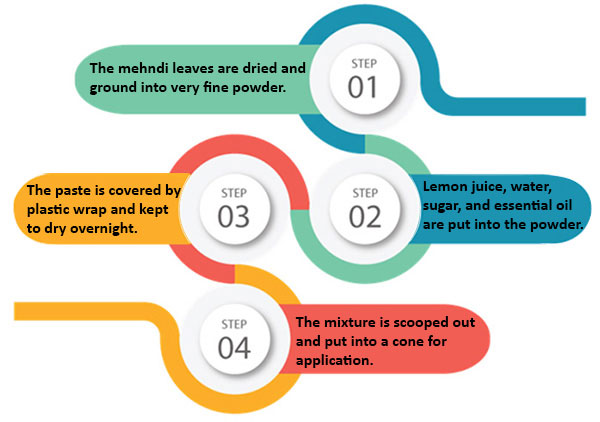 A bunch of mehndi leaves is collected from the mehndi plant. The leaves are washed and are left to dry in the sunlight. When the leaves dried and became crisp, they grounded into a very fine powder. This powder is a sieved couple of times so that no big piece remains in the powder. If the powder is bought from the market, then one should be sure if the powder has a greenish-brown tint. Now a container is taken, and the desired amount of mehndi powder is put in it. One part of lemon juice is mixed with three parts of water. One teaspoon of sugar and some drops of essential oil is added next and stirred well until the whole sugar dissolves in water. Tea or tamarind paste can also be mixed in it. Two tablespoons of the water solution are poured into the mehndi powder. It is stirred using a plastic spoon till the water is soaked by the mehndi powder. Then, two tablespoons of water are put in, and the process is repeated. Repeat the same process to avoid lumps in the paste. The paste is stirred until it is formed, and its consistency is that of mashed potato, smooth and creamy. The container is covered with a plastic wrap and is kept overnight or for six to seven hours. Then, paste from the container is scooped out with a spoon and is fill in the plastic cone or any other applicator.