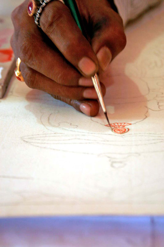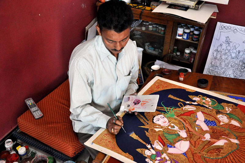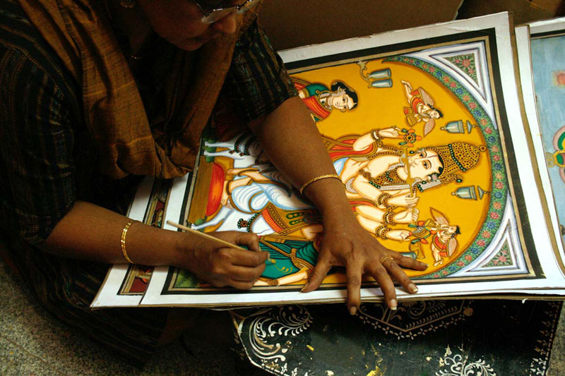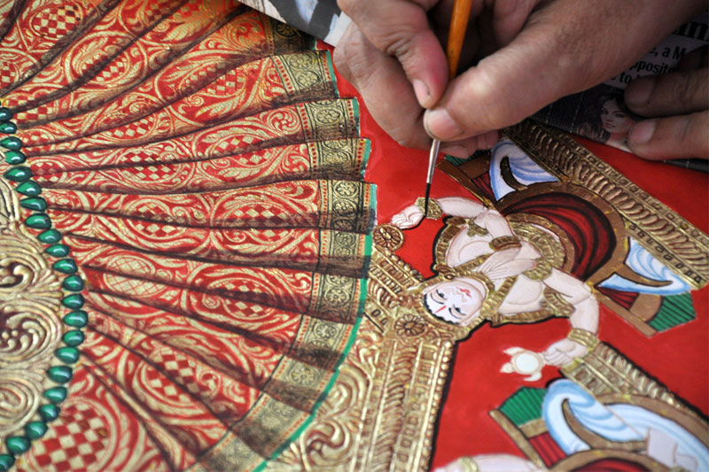 Earlier to make a base for painting, artists used to paste 10-20 layers of newspaper, on that they paste the drawing sheet over which they apply the paste of refined flour (Maida). Now days, artists have changed the technique of using the base. They use mount board, over which they paste ivory sheet or cartridge sheet and start the painting. The first step requires the artist to make a preliminary sketch of the image on the base. Thereafter, he makes a paste of zinc oxide and Arabic gum, known as 'gesso paste'. This paste is used to give a slightly raised effect of carving to those parts of the painting that require embellishments and is allowed to dry. The artist does two coatings of this paste to make a proper raised surface. Then, gold foil is pasted onto the surface, using Arabic gum. Now a day’s fevicolis used in place of gum. Some artists apply varnish after gesso paste so as to avoid cracking of gold foil in future. They left the gold foil dried for another 6-8 hours. After which they use brush to remove the excess gold. Some used cotton in place of brush. Since it is gold foil, which is very expensive, they use the left out gold foil on some other surfaces of painting. The rest of the painting is prepared with the help of water colors. Initially they used natural dyes, which are replaced by synthetic poster colors and water colors in modern times.