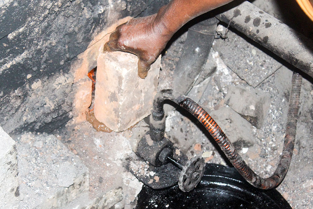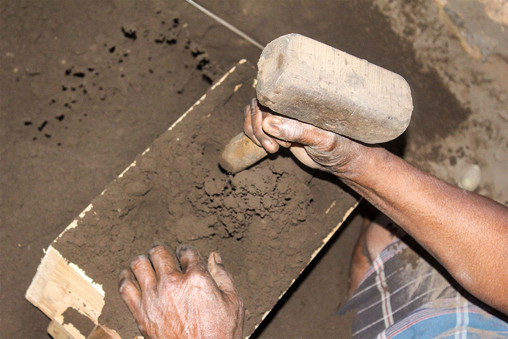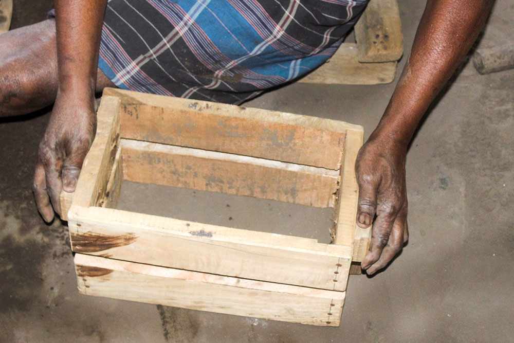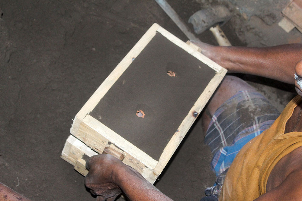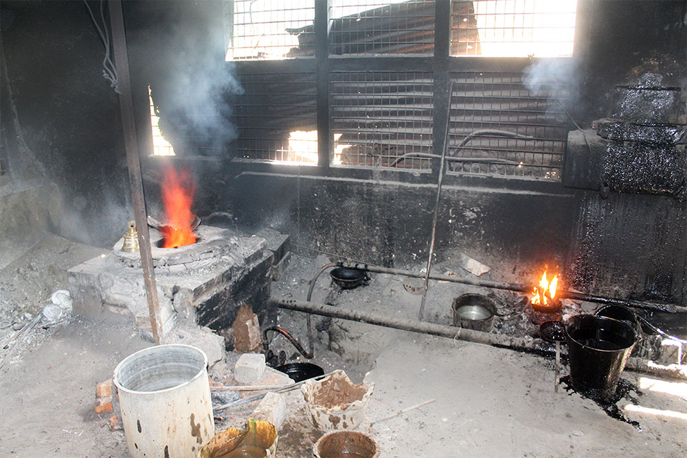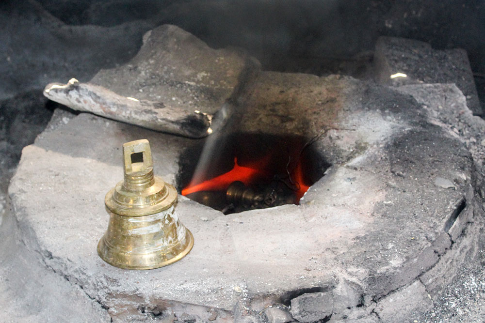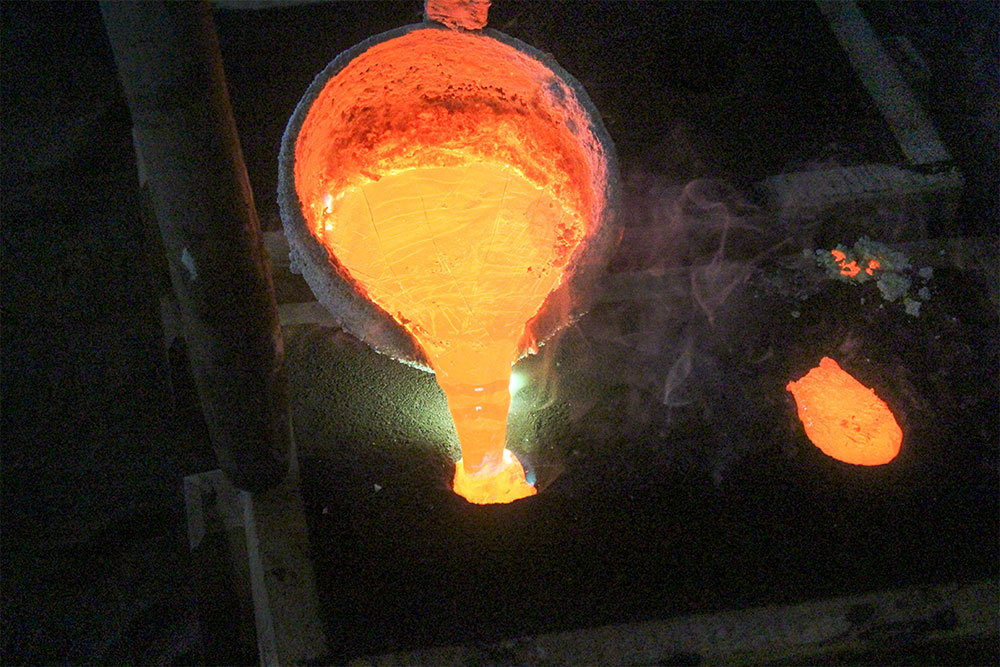 Now both the cope and drag are separated, and the master pattern is removed slowly with damaging the impression formed. Now the artisan makes a feeder hole in the cope to pour the molten metal into the mold and fill the cavity. Similarly, the drug runners are made for the metal to flow and fill the cavity. A runner is a path for the entrance of molten metal flow into the mold cavity. After making the runner, the drag is placed on the cope, locked, and now ready for casting. The metal for casting is collected from scrap metal. The scarp is cleaned, checked, and weighed. The required quantity of the scrap metal is taken and added to the crucible. The metal used in making the lamp is brass. Brass is a mixture of 40% zinc and 60% copper. The crucible is placed into the furnace and the metal and heated to its melting point of approximately 1200- 1300°C. Once the metal becomes molten, it is removed from the furnace, poured into the mold, and cooled.