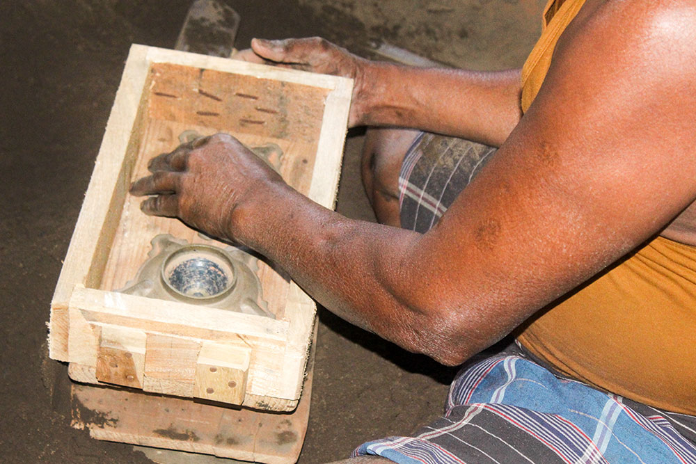 After cooling is complete, the mold is broken, opened, and the casting is taken out. The lamp is made out of five different parts; all the parts are produced similarly by casting.