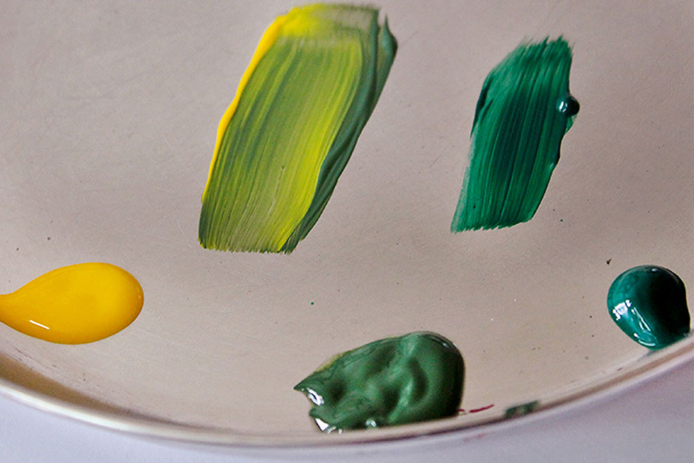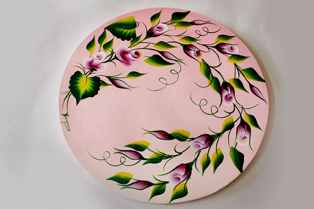 To paint the leaf design artist used brush number seven but chooses a different colour. The primary colour is thick, darker in the green shade, and the secondary colour used is yellow. The same technique is followed for leaf painting. The artist paints the leaves as many as required to keep the painting colourful. The technique of painting the leaf is to press hard at the beginning of the paint and go smooth as it ends. To paint a big size leaf, the artist chooses eight number brush and uses the green forest colour, which is another shade of green and yellow colour. These leaves enhance the beauty of buds. A small liner brush is used to give an outline to the buds, flowers, and leaves. A small line of the stem is drawn to connect these flower elements to enhance the painting. After this process, painting is completed and gives us a natural feel of a plant on the canvas cloth that is irresistible.