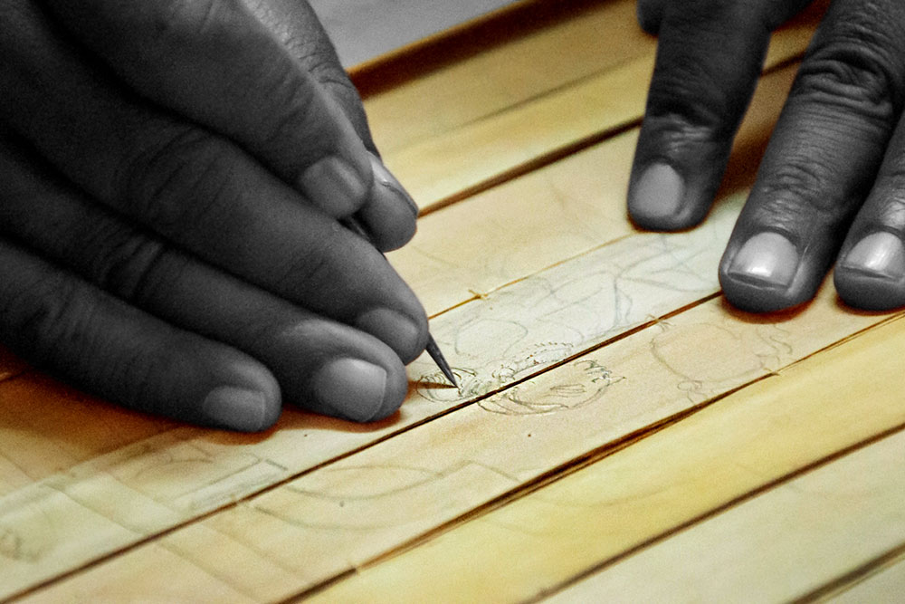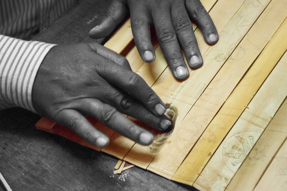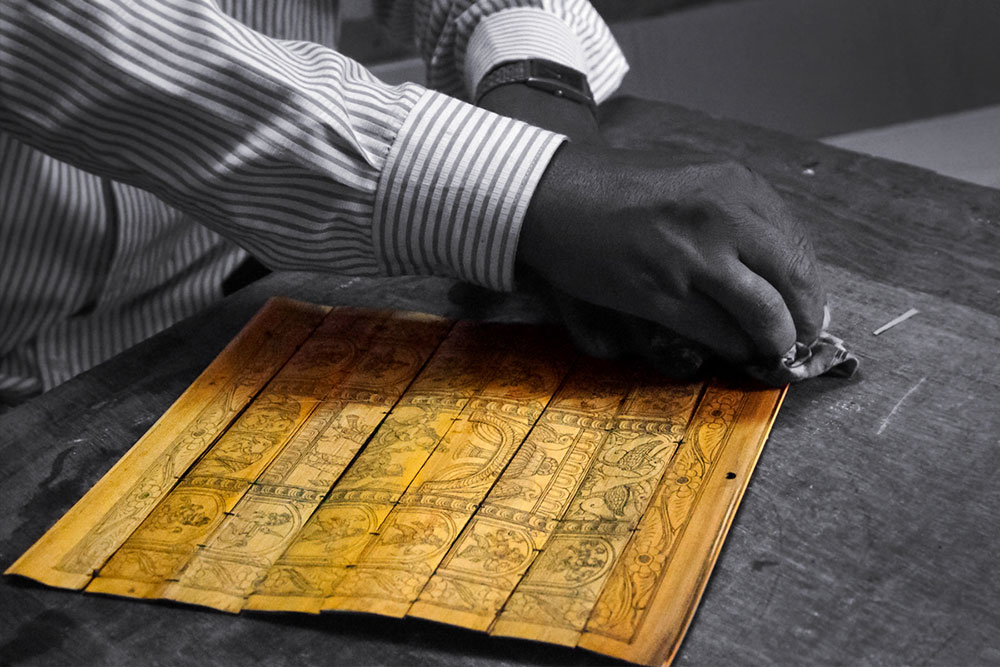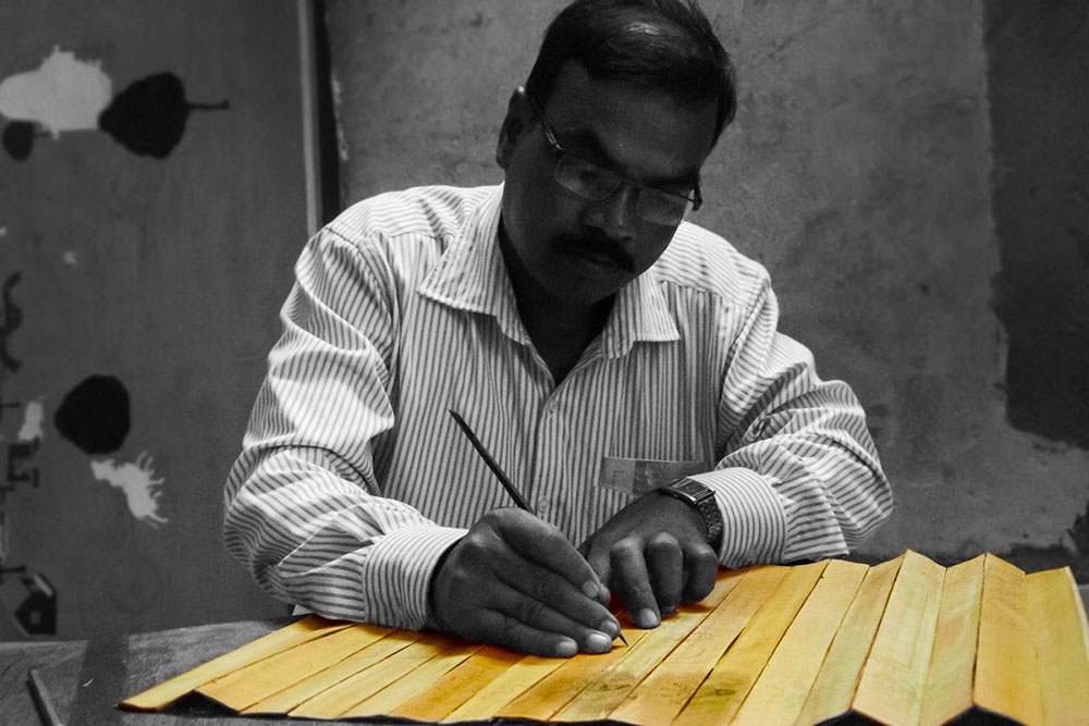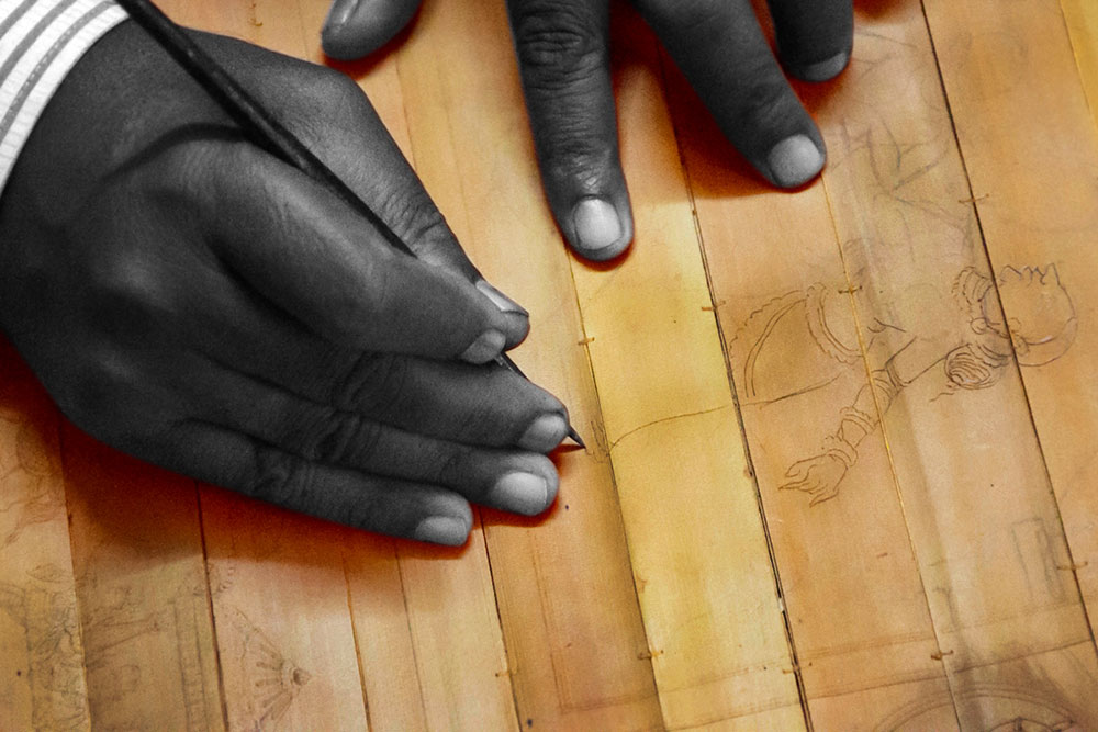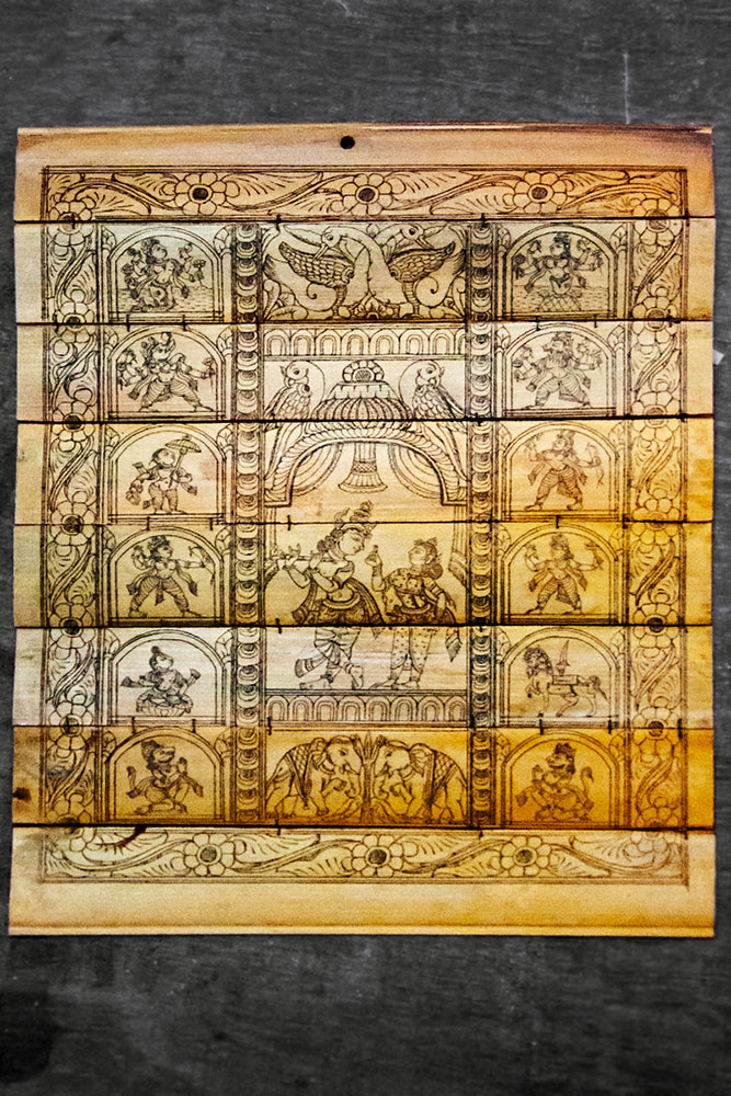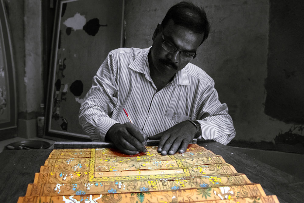 The palm leaves are dried under sun for two to three months. They are cut to the required sizes, soaked in water for days and treated with a solution of turmeric, ensuring the long last of the palm leaves and the painting. Once the leaves are dried, they are ready to be painted. The palm leaves are tied together to form a zigzag form of a scroll. Once the palm leaves (strips) are tied together a scene from one of the traditional stories is depicted in the drawing. The drawing is carefully done with appropriate spacing and with details of figures giving prominence to the hairstyle, ornaments, flora and fauna and elements that relate to nature. The painting on palm leaves is a unique process, unlike the regular paintings, a sharp pointed iron tool is used to etch the drawing on the brittle surface of the leaf, making sure that it doesn’t go wrong or the leaf doesn’t break, the color is spread or rubbed all over the leaves with the help of piece of cotton cloth. The scroll is cleansed and wiped with cloth giving it a fine black color to the carved lines leaving the rest of surface clean. The artists on occasion, to give it a stencil like appearance. This requires a great deal of accuracy and skill, as the palm leaf is brittle and has reversing grains interfering with a smooth usage of the cutting blade. Such beautifully positioned cut outs make the painting even more intricate and lace like. Sometimes the artists use colour to beautify the painting by coloring with natural colours. The colors are prepared by the artists. There are five basic colors they use white, black and primary colors- red, blue and yellow. The color white is prepared from conch shell, soot from lamp that is lamp black with oil makes black color. Colors from vegetables are extracted as well, for green color green leaves like neem (azadirachta indica) are boiled and mixed with water and gum to prepare the color. Addition of color and cut out technique are all the developments of recent times compared to the oldness of the art and have taken this form of art to another level.