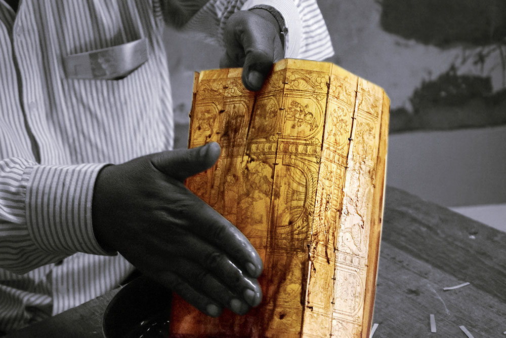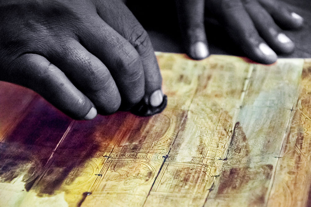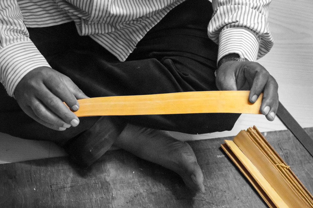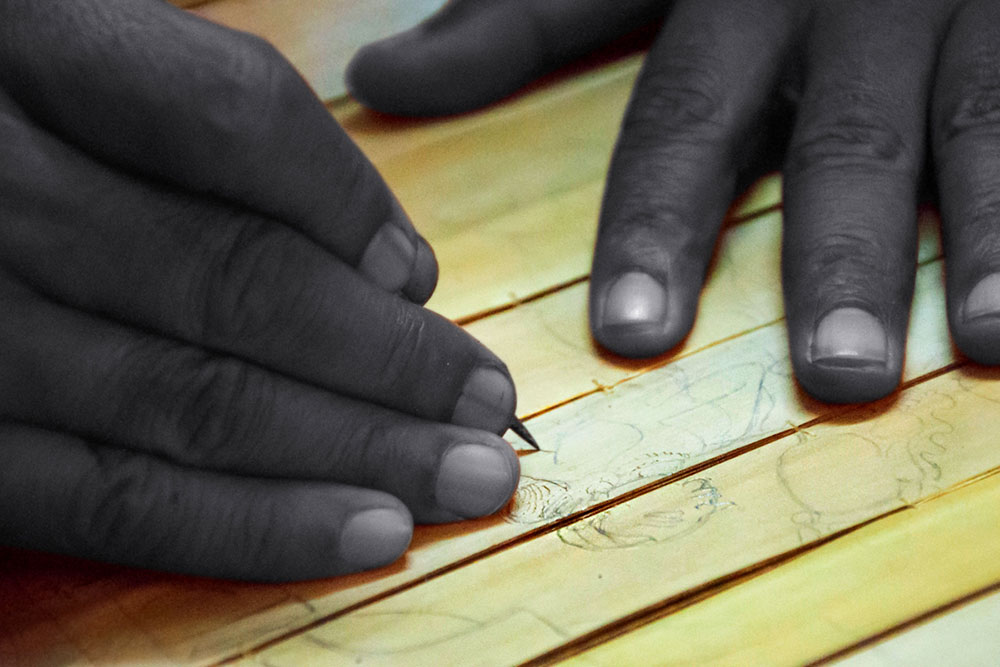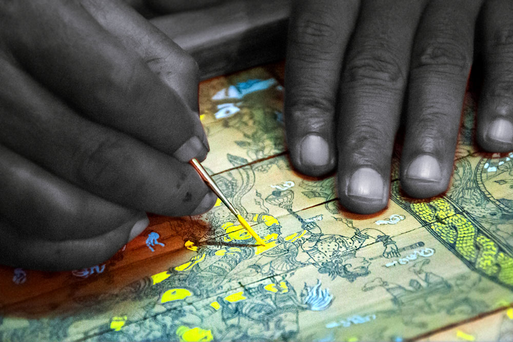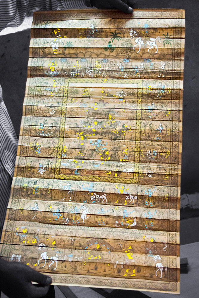 The palm leaves are dried under sun for two to three months. They are cut to the required sizes, soaked in water for days and treated with a solution of turmeric, ensuring the long last of the palm leaves and the painting. Once the leaves are dried, they are ready to be painted. The palm leaves are tied together to form a zigzag form of a scroll. Once the palm leaves (strips) are tied together a scene from one of the traditional stories is depicted in the drawing. The drawing is carefully done with appropriate spacing and with details of figures giving prominence to the hairstyle, ornaments, flora and fauna and elements that relate to nature. The painting on palm leaves is a unique process, unlike the regular paintings, a sharp pointed iron tool is used to etch the drawing on the brittle surface of the leaf, making sure that it doesn’t go wrong or the leaf doesn’t break, the color is spread or rubbed all over the leaves with the help of piece of cotton cloth. The scroll is cleansed and wiped with cloth giving it a fine black color to the carved lines leaving the rest of surface clean. The artists on occasion, to give it a stencil like appearance. This requires a great deal of accuracy and skill, as the palm leaf is brittle and has reversing grains interfering with a smooth usage of the cutting blade. Such beautifully positioned cut outs make the painting even more intricate and lace like. Sometimes the artists use colour to beautify the painting by coloring with natural colours. The colors are prepared by the artists. There are five basic colors they use white, black and primary colors- red, blue and yellow. The color white is prepared from conch shell, soot from lamp that is lamp black with oil makes black color. Colors from vegetables are extracted as well, for green color green leaves like neem (azadirachta indica) are boiled and mixed with water and gum to prepare the color. Addition of color and cut out technique are all the developments of recent times compared to the oldness of the art and have taken this form of art to another level.