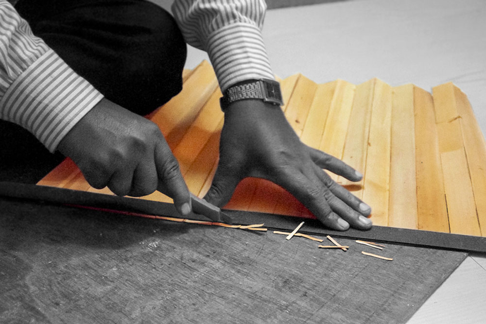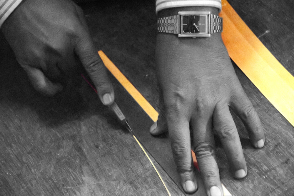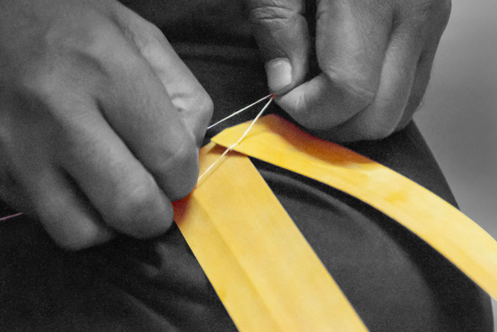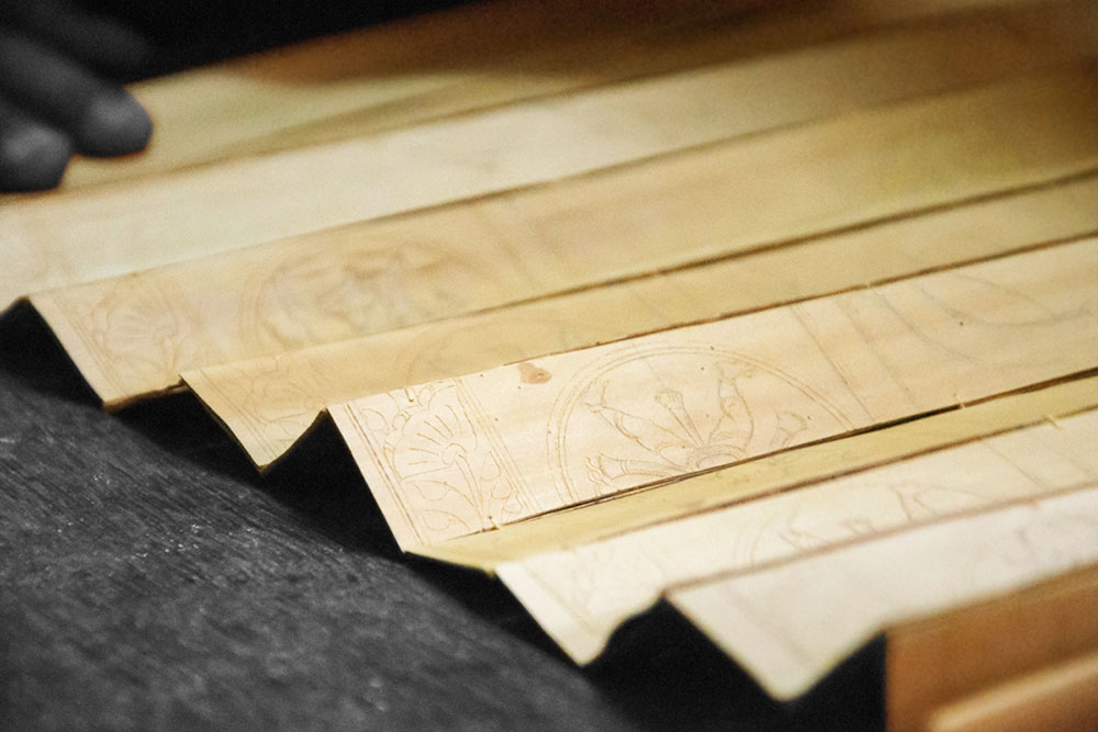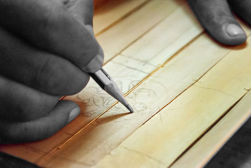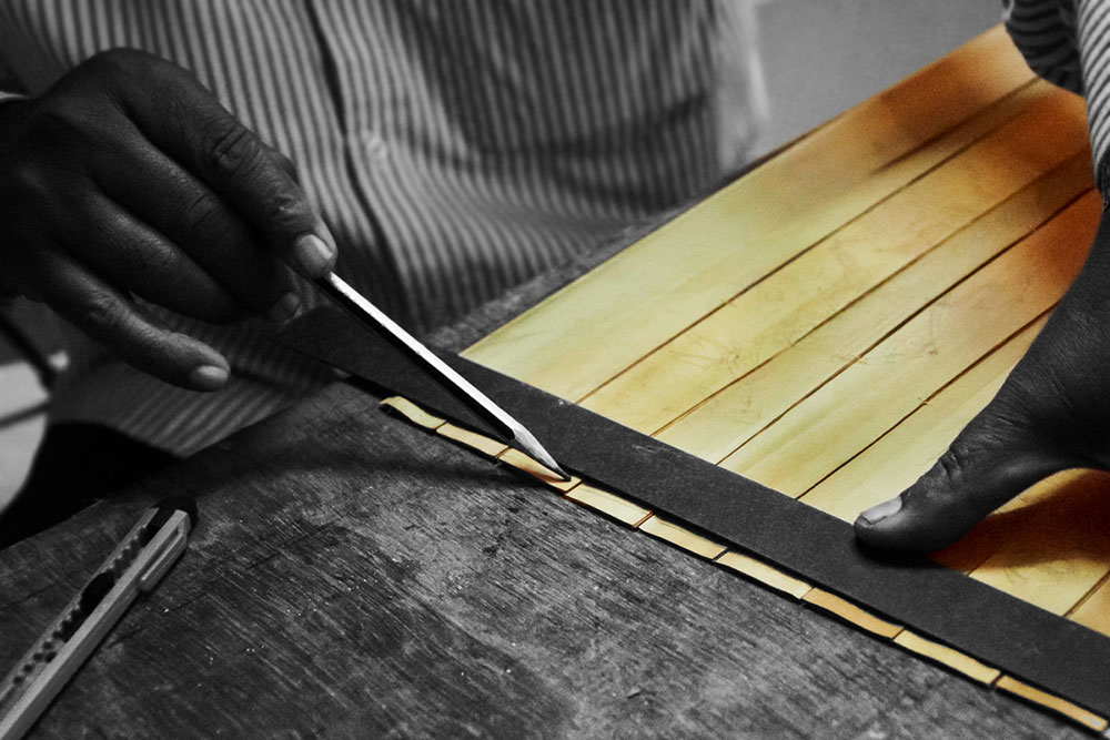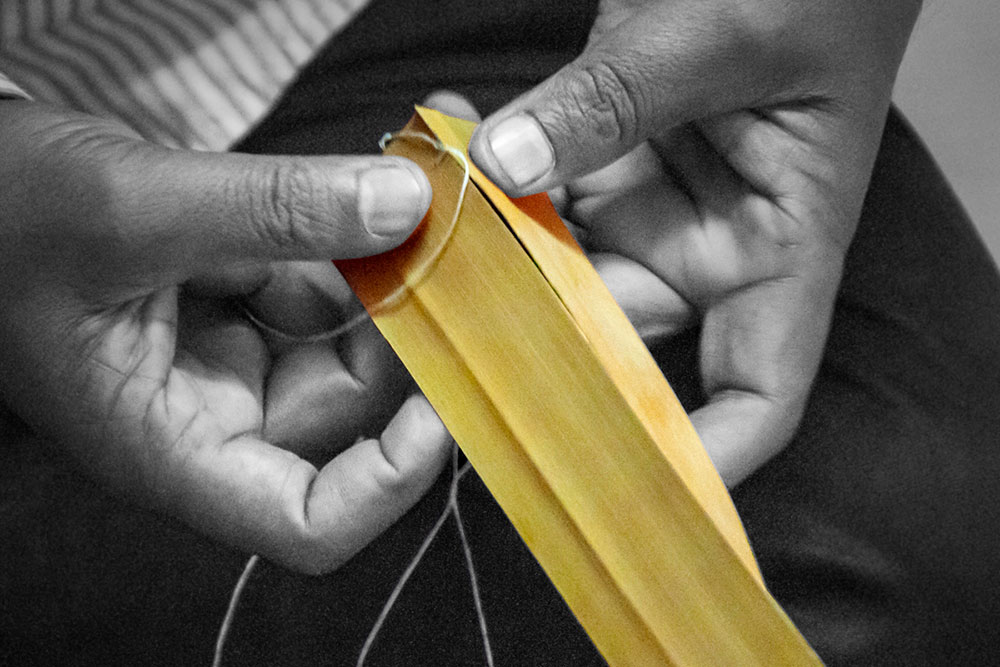 The palm leaves are dried under sun for two to three months. They are cut to the required sizes, soaked in water for days and treated with a solution of turmeric, ensuring the long last of the palm leaves and the painting. Once the leaves are dried, they are ready to be painted. The palm leaves are tied together to form a zigzag form of a scroll. Once the palm leaves (strips) are tied together a scene from one of the traditional stories is depicted in the drawing. The drawing is carefully done with appropriate spacing and with details of figures giving prominence to the hairstyle, ornaments, flora and fauna and elements that relate to nature. The painting on palm leaves is a unique process, unlike the regular paintings, a sharp pointed iron tool is used to etch the drawing on the brittle surface of the leaf, making sure that it doesn’t go wrong or the leaf doesn’t break, the color is spread or rubbed all over the leaves with the help of piece of cotton cloth. The scroll is cleansed and wiped with cloth giving it a fine black color to the carved lines leaving the rest of surface clean. The artists on occasion, to give it a stencil like appearance. This requires a great deal of accuracy and skill, as the palm leaf is brittle and has reversing grains interfering with a smooth usage of the cutting blade. Such beautifully positioned cut outs make the painting even more intricate and lace like. Sometimes the artists use colour to beautify the painting by coloring with natural colours. The colors are prepared by the artists. There are five basic colors they use white, black and primary colors- red, blue and yellow. The color white is prepared from conch shell, soot from lamp that is lamp black with oil makes black color. Colors from vegetables are extracted as well, for green color green leaves like neem (azadirachta indica) are boiled and mixed with water and gum to prepare the color. Addition of color and cut out technique are all the developments of recent times compared to the oldness of the art and have taken this form of art to another level.