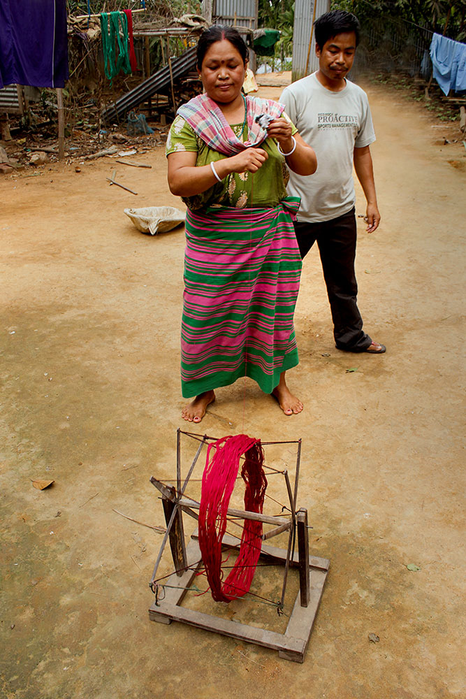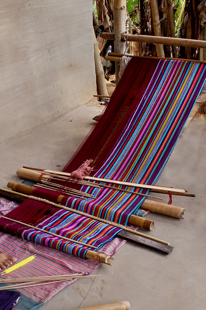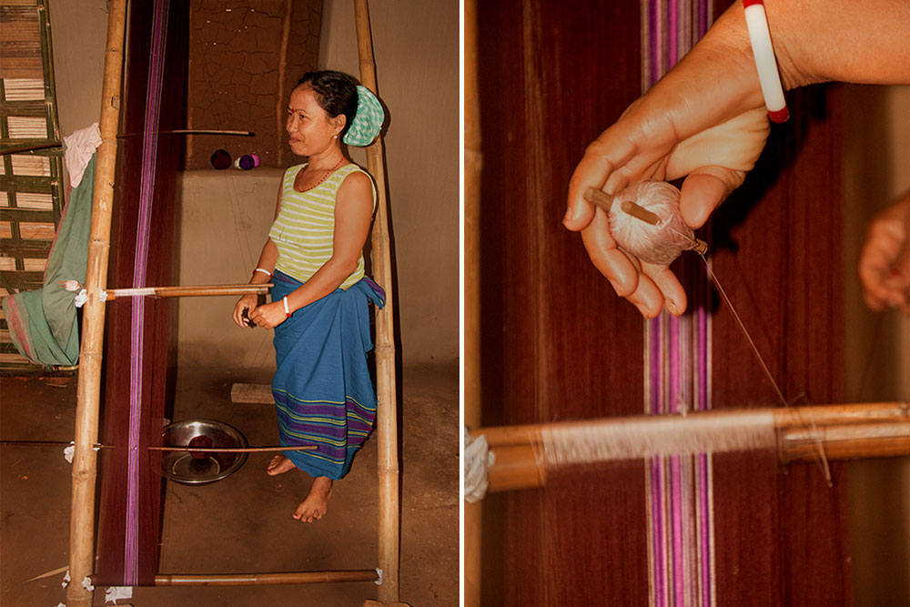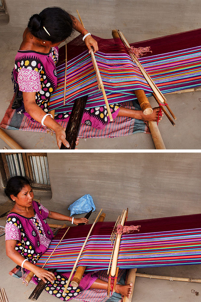The heddle stick is simultaneously lifted in the left hand; a circular bamboo bar is pressed down with the right hand. Vertically the sword is placed in the shed, and the weft yarns passed from the right side using the right hand through shuttle and picked up by the left hand. Through this sword, the weft is beaten, and the sword is taken out. Thus the center shed is made, and the shuttle is passed from the left side to the right side. Again the sword is placed to beat the weft yarn. This process is carried on repeatedly. When the weaving gets to begin, two bamboo splits work. This process continues until the pattern is woven. Patterns like colourful stripes run in the direction of the warp, and the geometric motifs are woven in the direction of the weft. These patterns, designs, and colouring all vary from tribe to tribe.