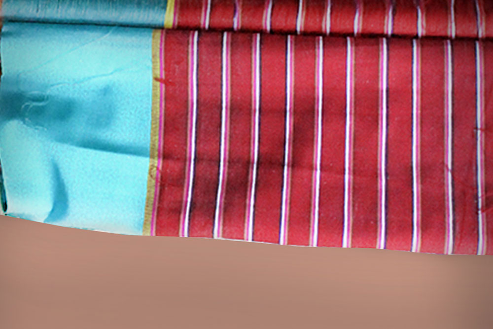 Further, these yarns are used for weaving the traditional Tripura saree. The backstrap loom is used in Tripura for weaving the saree. All the operations are done manually here. Warp yarns are cut as per the length of fabric and fixed inappropriate tension. Two loops present in the ends of the back strap are attached to the notches of the front bar. In this sort of loom, all types of weaves can be woven. There are numerous possibilities to weave a variety of patterns. The backstrap is fixed to the weaver’s back, keeping their legs against the footrest. This footrest is adjustable for maintaining the tension in the loom. Weaving in the backstrap loom consists of shedding motion, picking motion, and beating motion.