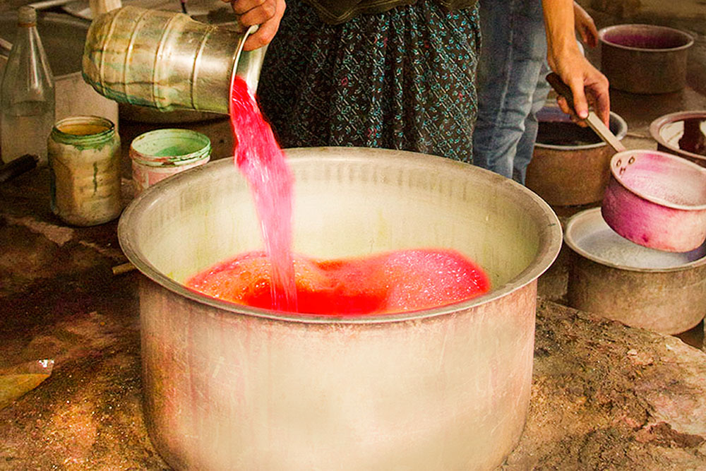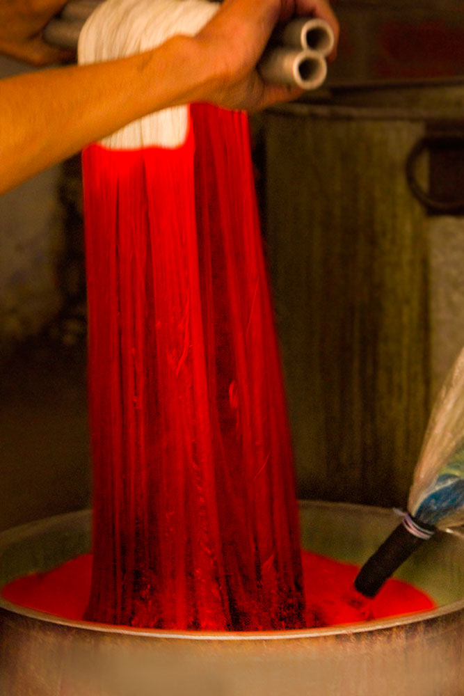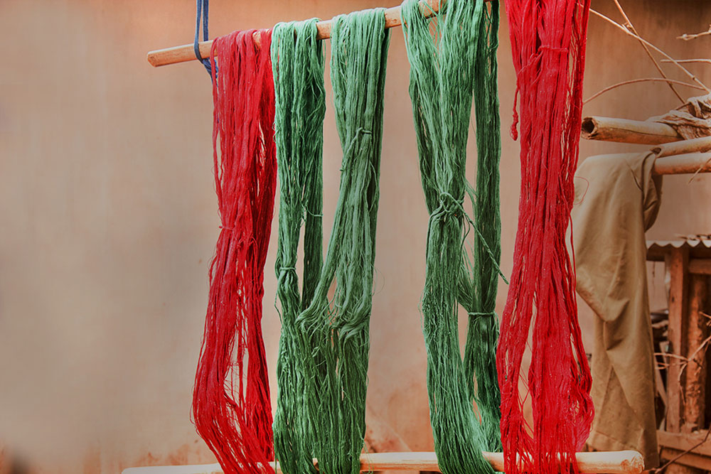 The art of weaving Tripura traditional saree gets initiated by the dyeing process. Water is boiled at a high temperature, and the required colour is added to it. The water is stirred thoroughly to mix the colour well in water. Cotton yarns are soaked in cold water first and arranged on the rods. These yarns are held tight together and dipped thoroughly in coloured boiling water. Multiple times of dipping the yarns are done to spread the colour uniformly. Once the yarns are dyed, they are taken out from the coloured boiling water and hung inside the room. It is allowed to dry completely at room temperature.