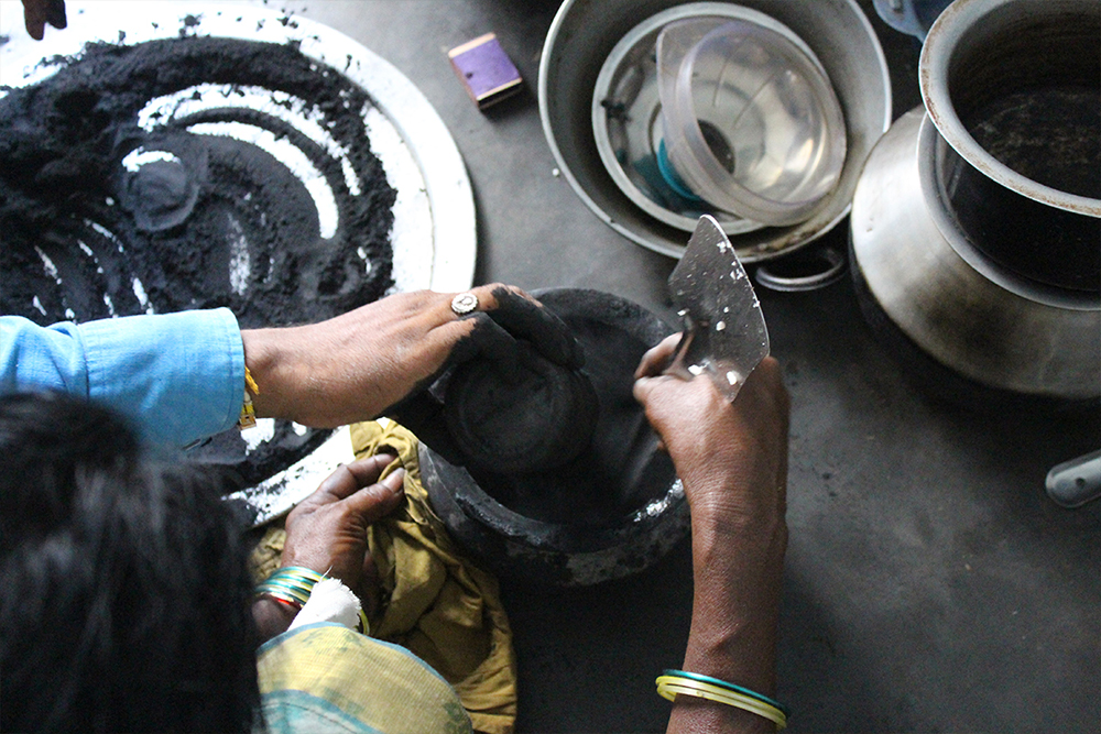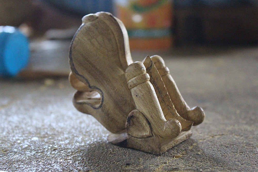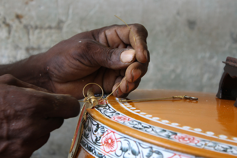 There is a lot of decorative inlay carving on the body of the Veena, which has been done on a plastic sheet. Earlier, these inlays were of ivory. The carved inlays are coloured using the lac. The lac is heated and filled in the carving grooves; once it's dried, the inlay is scraped using a blade to remove the excess lac, which leaves only the grooves filled with colours, and the design appears. Depending on the customer's requirement, the Veena is painted or polished. Once it is ready, the Veena is sent for tuning. It takes around 20 days to make one complete Veena.