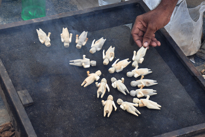 Initially, the design is marked on the surface of the wood. The wood blocks are then carved with bahudara (chisel) into the desired shape of the toy. The chiseled components are then filed to remove uneven edges. All the pieces like Body, Head, Ears, Trunk, Tail are carved separately and fitted together with glue and a slow process of heating on a wire frame is done to evaporate the moisture.
