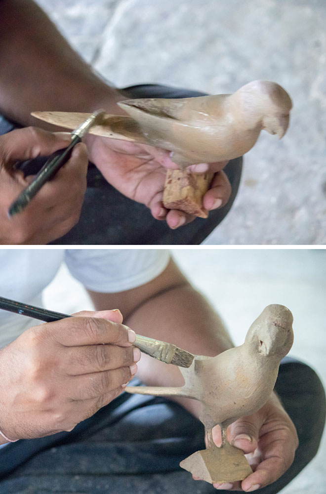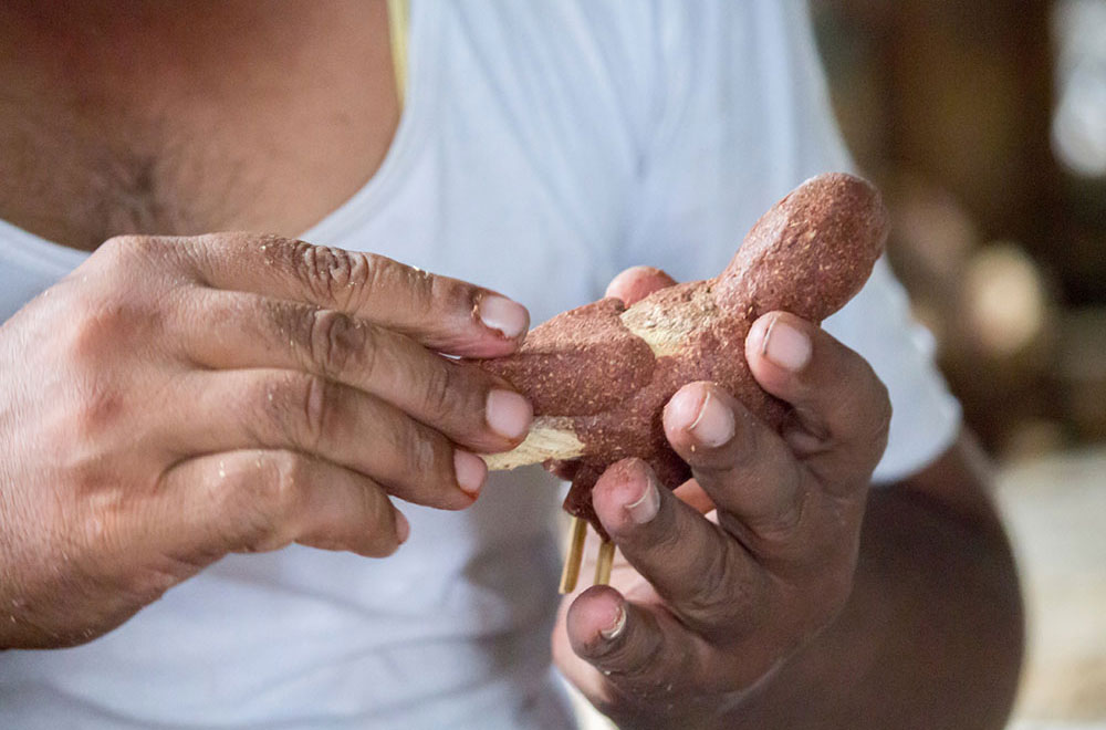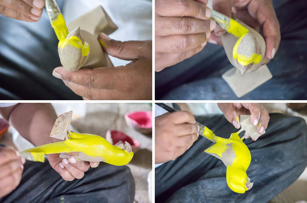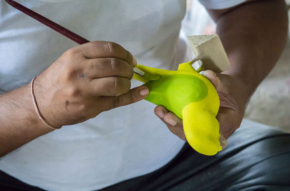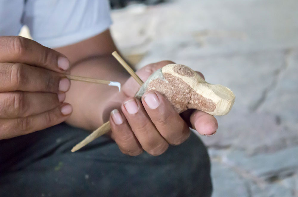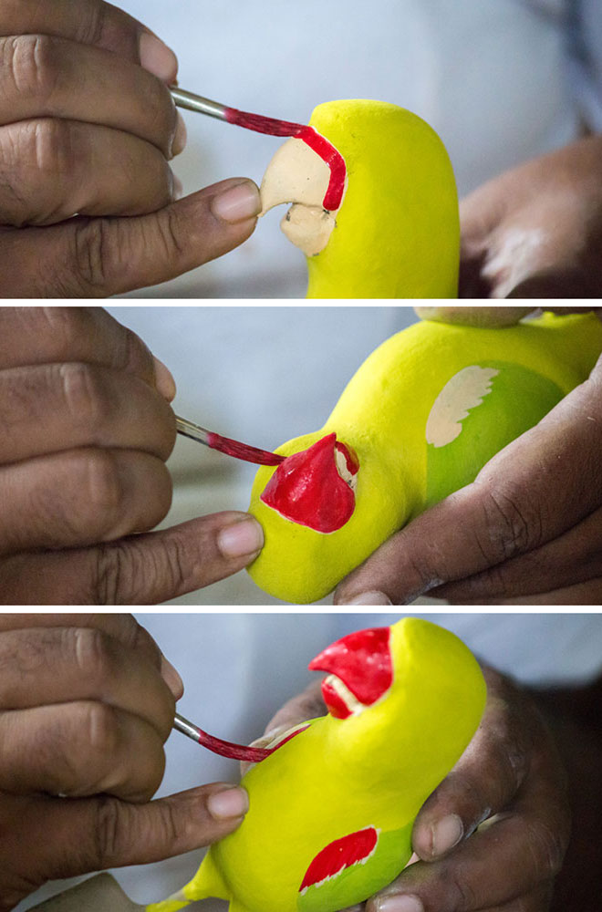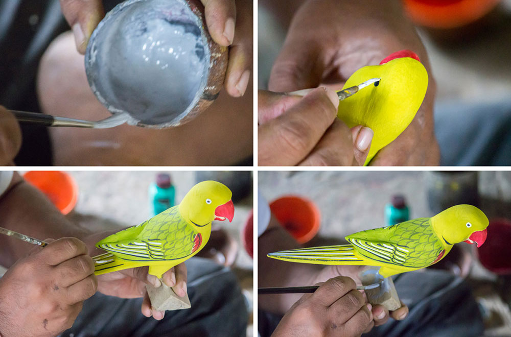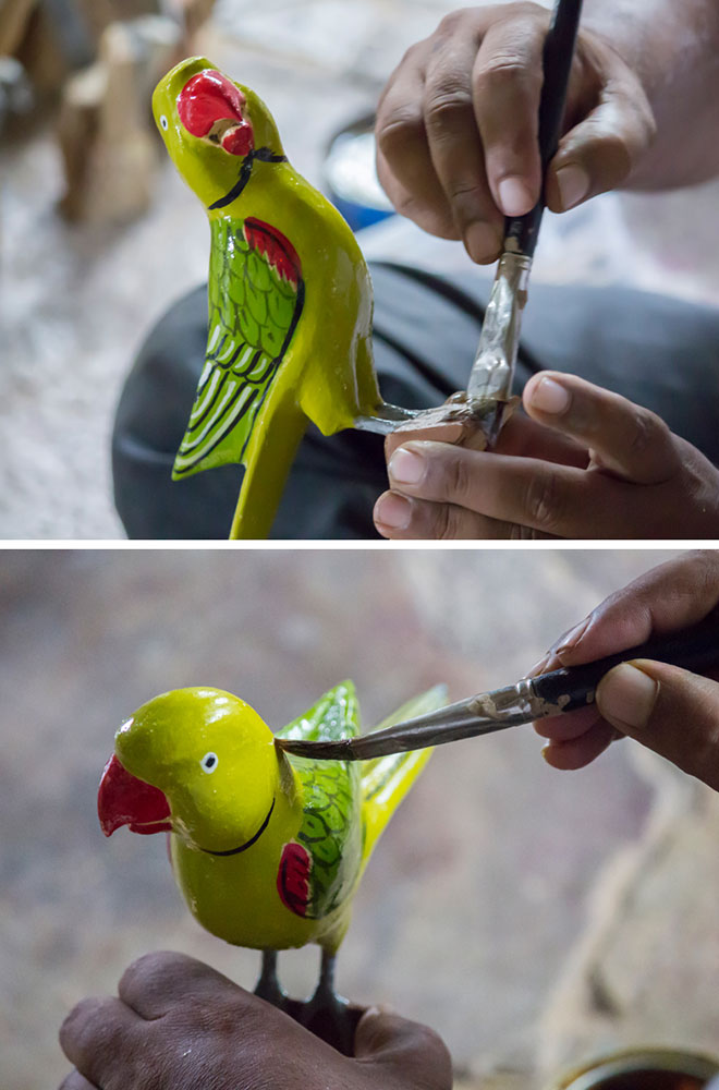 Nirmal wooden toys are made of a softwood called poniki or white sander. The seasoned wooden logs are bought and cut into small wooden planks using a cutting machine. Further, they are cut into smaller pieces as per the requirement using the saw tool. These wooden pieces are further shaped using a file tool. The shaped wood pieces are further attached using glue or tightly fixed in-between the gaps. Upon the basic structure, the paste is applied. The paste is a mixture of sawdust and tamarind seeds that are ground well and kneaded together with water to get the required consistency. This paste is applied to the basic structuring of the wooden structure of the toy. Adding this paste to the wooden structure enhances in pertaining the fine curvatures of the toy. Further, this is allowed for drying. Once it is dried, it is sanded neatly and fine details are made. As a final process, the toys are painted and allowed for drying. Thus the Nirmal wooden toys are set ready for the sales.