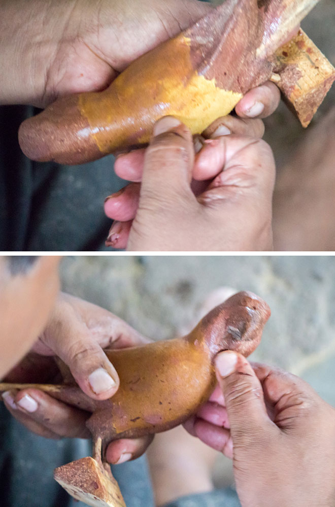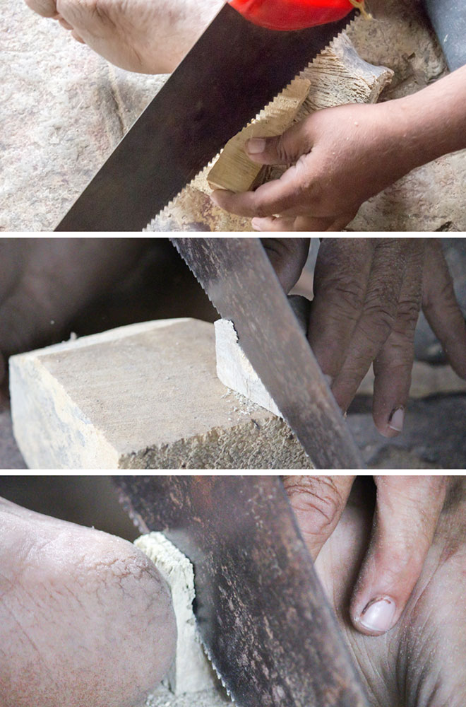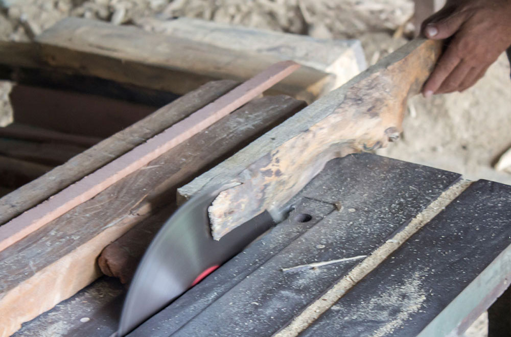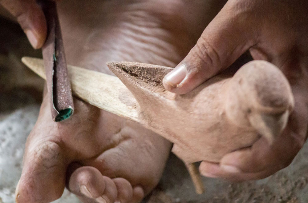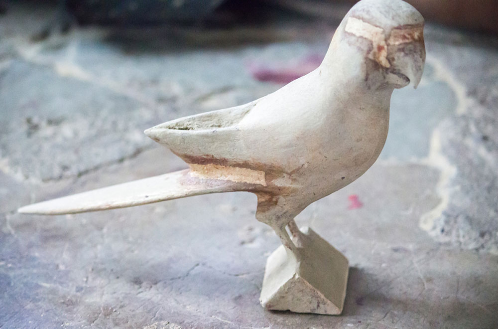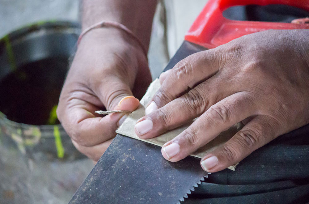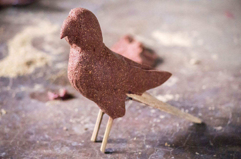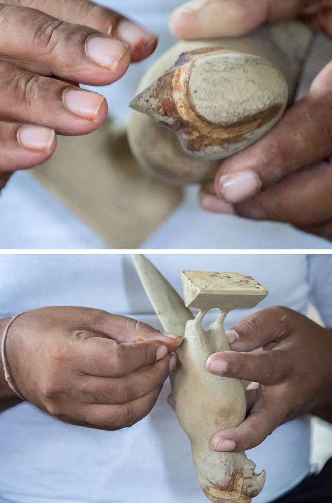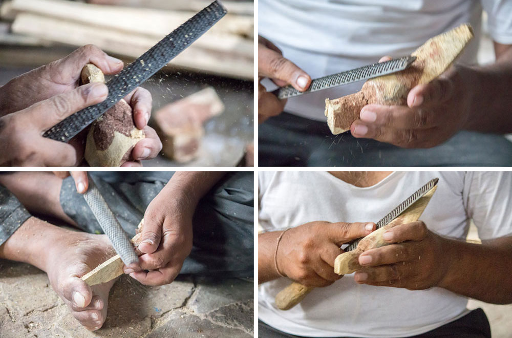 Nirmal wooden toys are made of a softwood called poniki or white sander. The seasoned wooden logs are bought and cut into small wooden planks using a cutting machine. Further, they are cut into smaller pieces as per the requirement using the saw tool. These wooden pieces are further shaped using a file tool. The shaped wood pieces are further attached using glue or tightly fixed in-between the gaps. Upon the basic structure, the paste is applied. The paste is a mixture of sawdust and tamarind seeds that are ground well and kneaded together with water to get the required consistency. This paste is applied to the basic structuring of the wooden structure of the toy. Adding this paste to the wooden structure enhances in pertaining the fine curvatures of the toy. Further, this is allowed for drying. Once it is dried, it is sanded neatly and fine details are made. As a final process, the toys are painted and allowed for drying. Thus the Nirmal wooden toys are set ready for the sales.