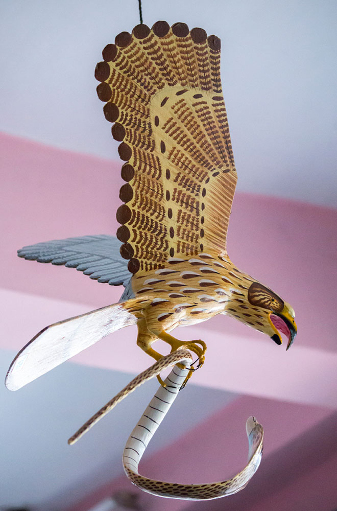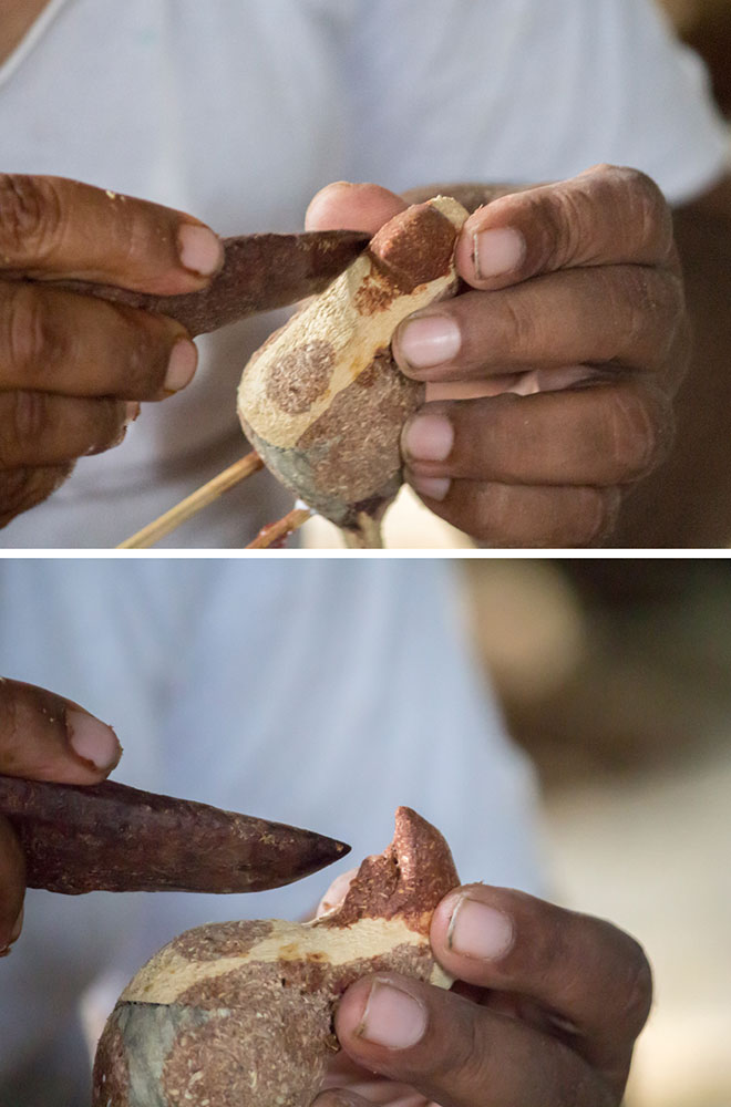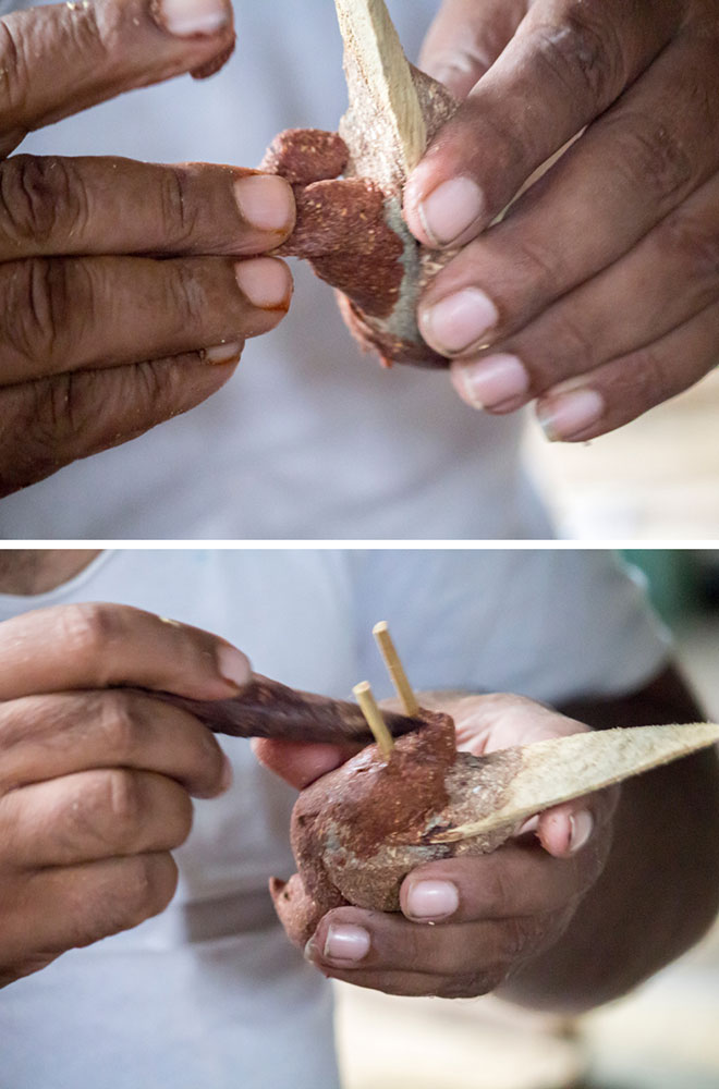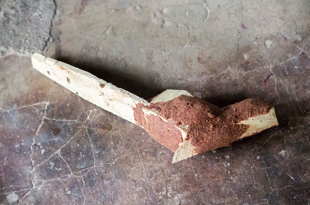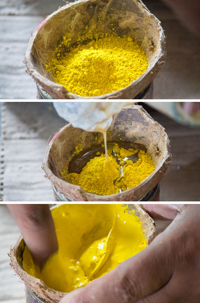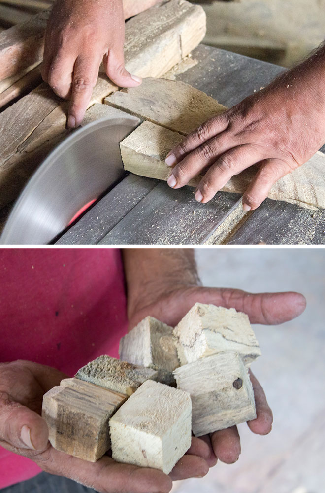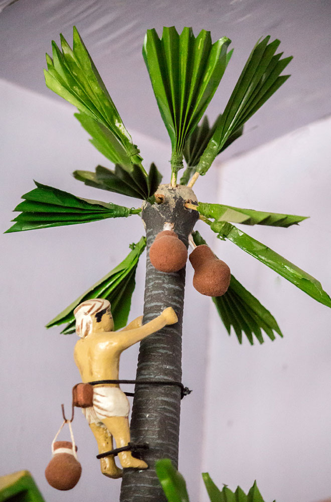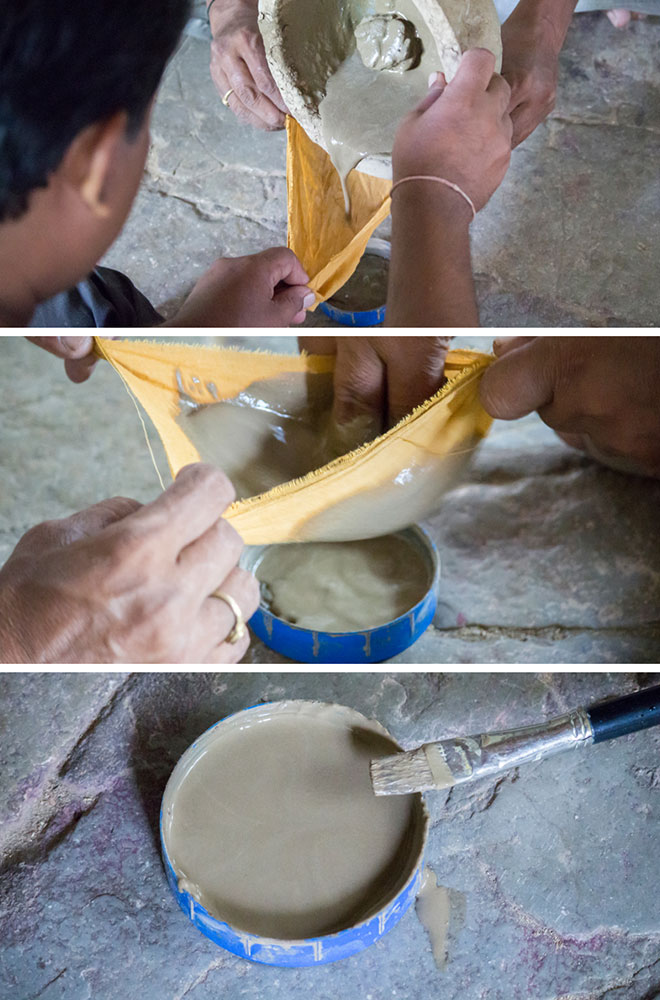 Nirmal wooden toys are made of a softwood called poniki or white sander. The seasoned wooden logs are bought and cut into small wooden planks using a cutting machine. Further, they are cut into smaller pieces as per the requirement using the saw tool. These wooden pieces are further shaped using a file tool. The shaped wood pieces are further attached using glue or tightly fixed in-between the gaps. Upon the basic structure, the paste is applied. The paste is a mixture of sawdust and tamarind seeds that are ground well and kneaded together with water to get the required consistency. This paste is applied to the basic structuring of the wooden structure of the toy. Adding this paste to the wooden structure enhances in pertaining the fine curvatures of the toy. Further, this is allowed for drying. Once it is dried, it is sanded neatly and fine details are made. As a final process, the toys are painted and allowed for drying. Thus the Nirmal wooden toys are set ready for the sales.