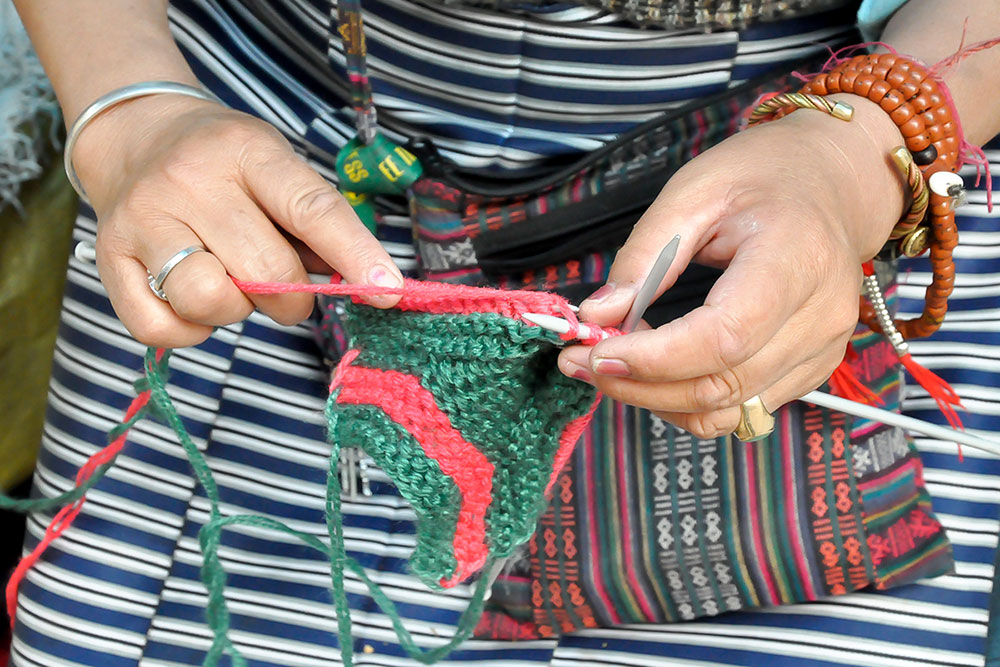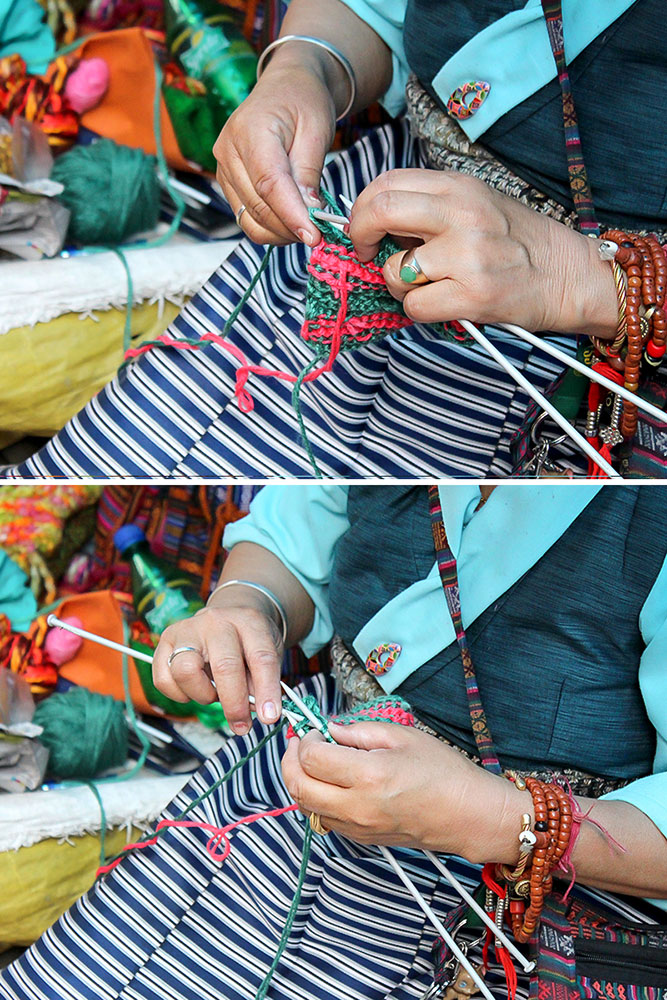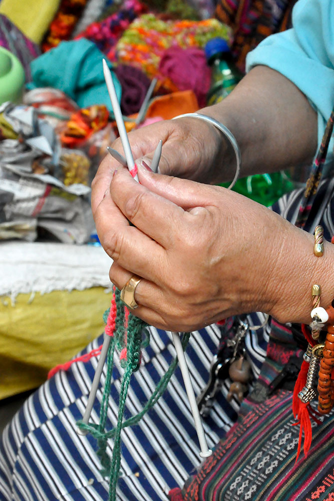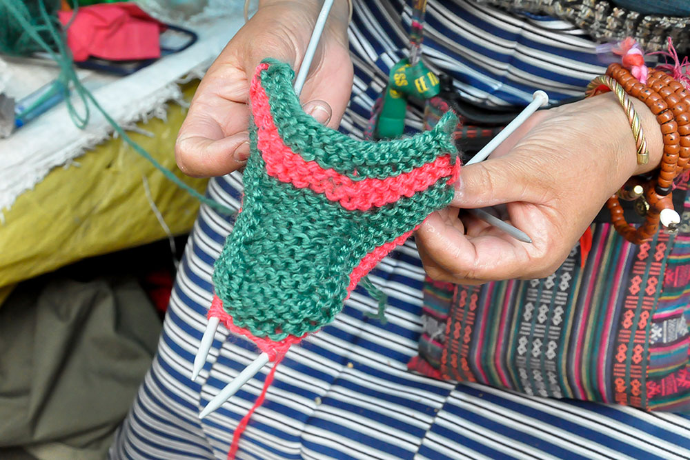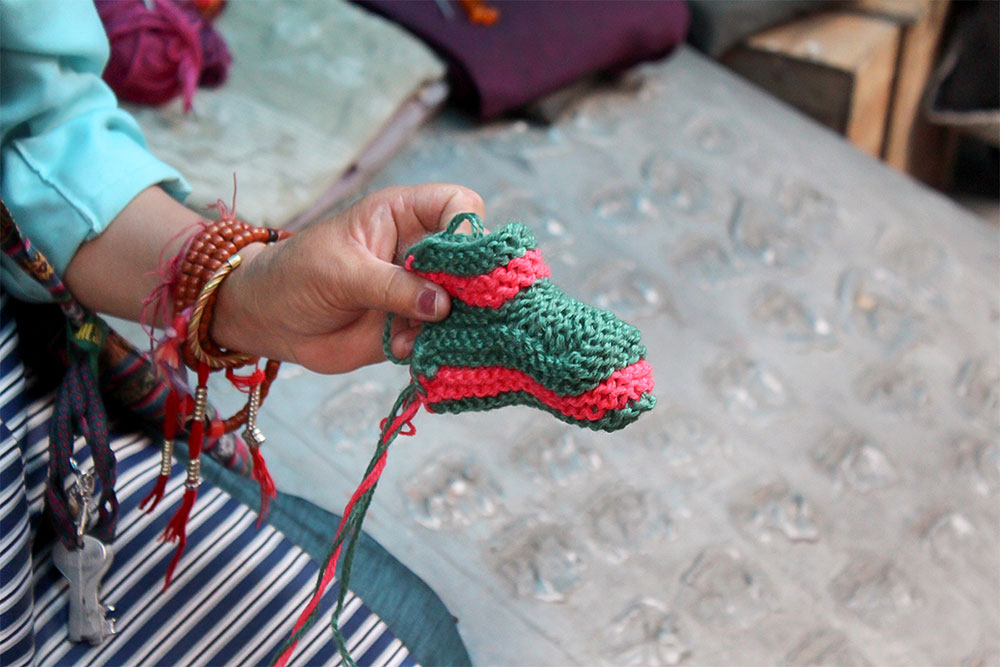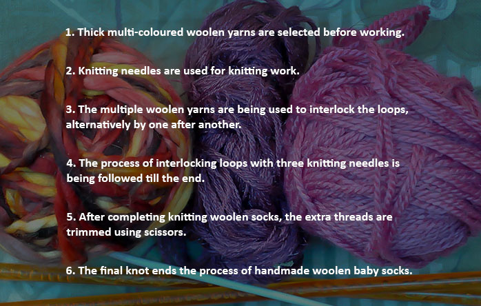 The raw materials required here are; woolen yarn and three straight knitting needles. The process starts with a slipknot and then interlocking of wool loops from its start end. These interlocking are slowly developed until it forms the expected pattern. Multi colours of woolen threads are used to innovate with the designs and patterns. Once the skill is mastered, the artist would take only a few hours to complete a pair of socks. At such conditions, their hands would perform the knitting so fast that an observer can hardly identify the prime loop through which the whole pattern is connected. Though the artisan starts with two straight needles, later, when the work grows, the third needle is added for faster completion. Once the sides are finished, the artisan flips the woolen knitting and connects the base layer by knitting it. After knitting the base, the artisan ends it with a knot. The interlinking of multi-coloured yarns is what makes these baby socks more likable. For baby socks, the woolen threads used are extra soft and usually combine contrast colours.
