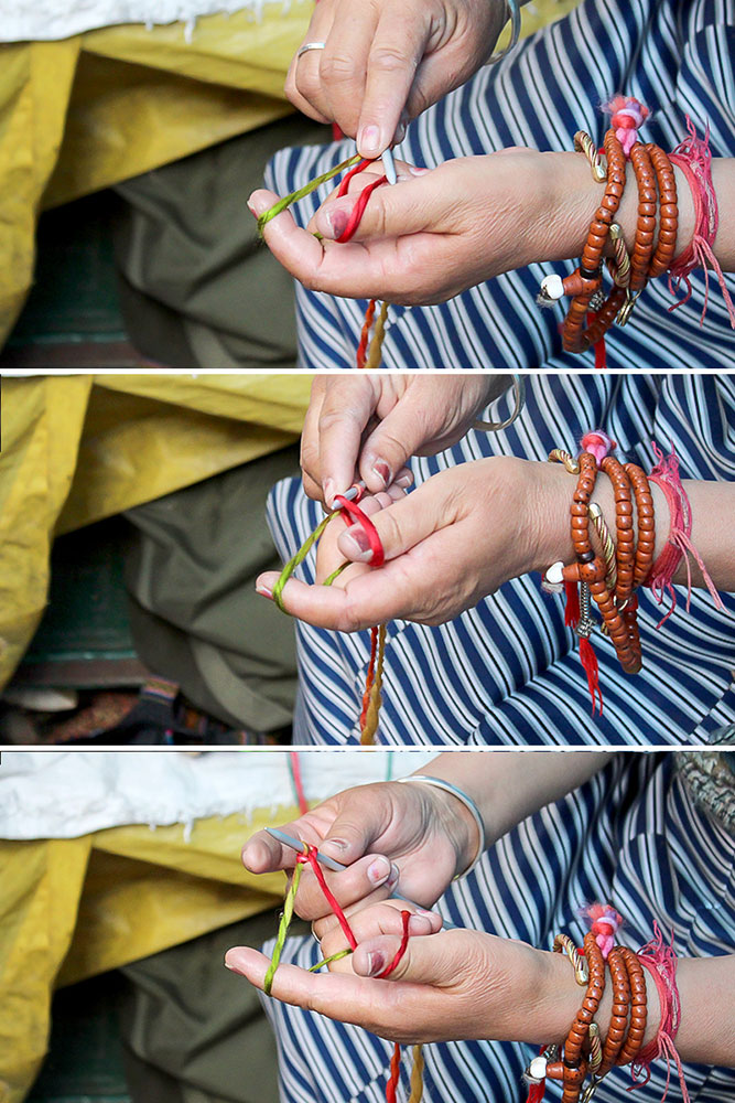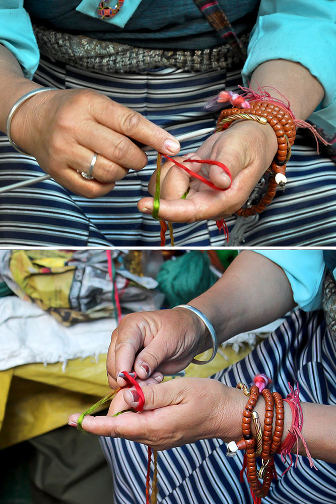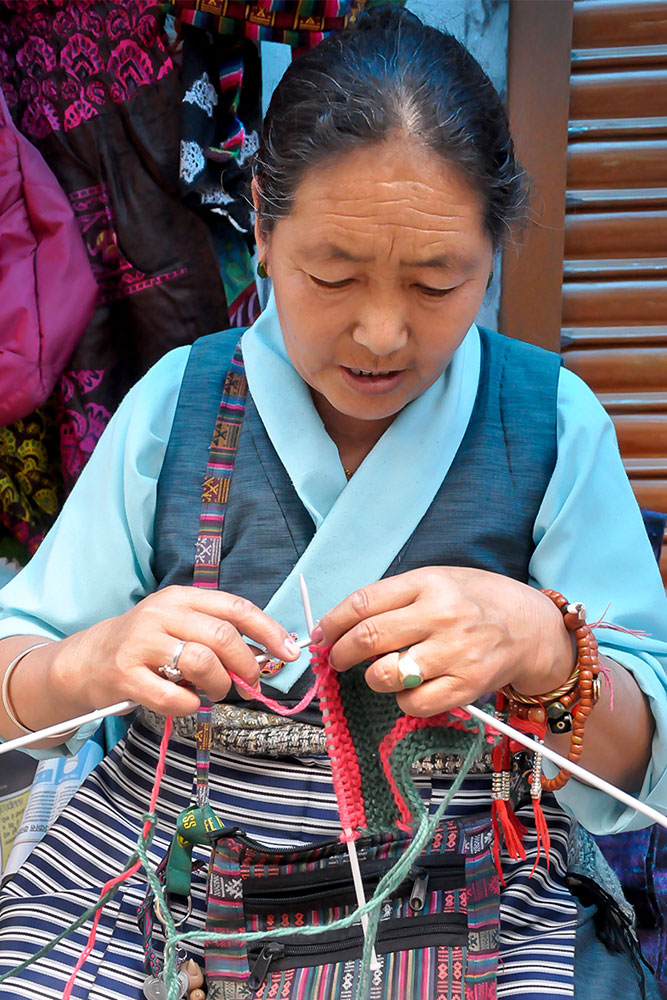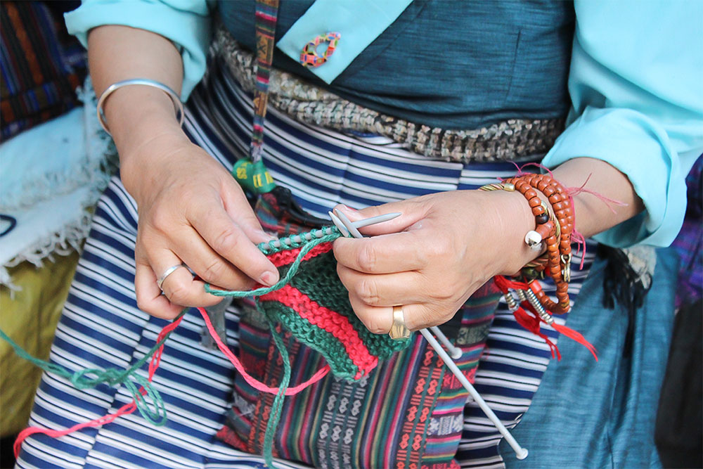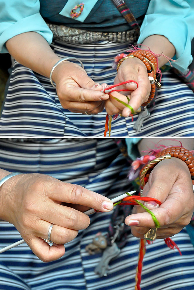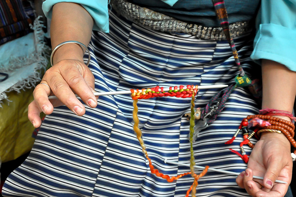 The raw materials required here are; woolen yarn and three straight knitting needles. The process starts with a slipknot and then interlocking of wool loops from its start end. These interlocking are slowly developed until it forms the expected pattern. Multi colours of woolen threads are used to innovate with the designs and patterns. Once the skill is mastered, the artist would take only a few hours to complete a pair of socks. At such conditions, their hands would perform the knitting so fast that an observer can hardly identify the prime loop through which the whole pattern is connected. Though the artisan starts with two straight needles, later, when the work grows, the third needle is added for faster completion. Once the sides are finished, the artisan flips the woolen knitting and connects the base layer by knitting it. After knitting the base, the artisan ends it with a knot. The interlinking of multi-coloured yarns is what makes these baby socks more likable. For baby socks, the woolen threads used are extra soft and usually combine contrast colours.